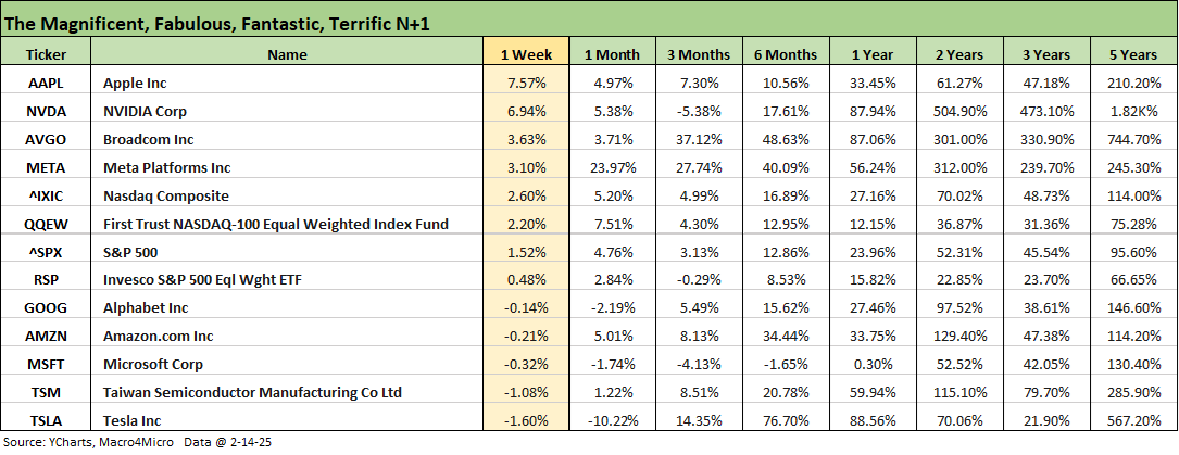 The tech bellwether performance had fewer anomalies and less divergence this past week with Apple and NVIDIA leading the pack after some of the recent weakness in tech. The table lines up the line items in descending order of total returns for the week. We see 4 of the Mag 7 in the red and the other 3 of the Mag 7 ahead of the NASDAQ joined by Broadcom.