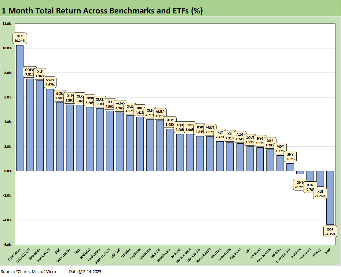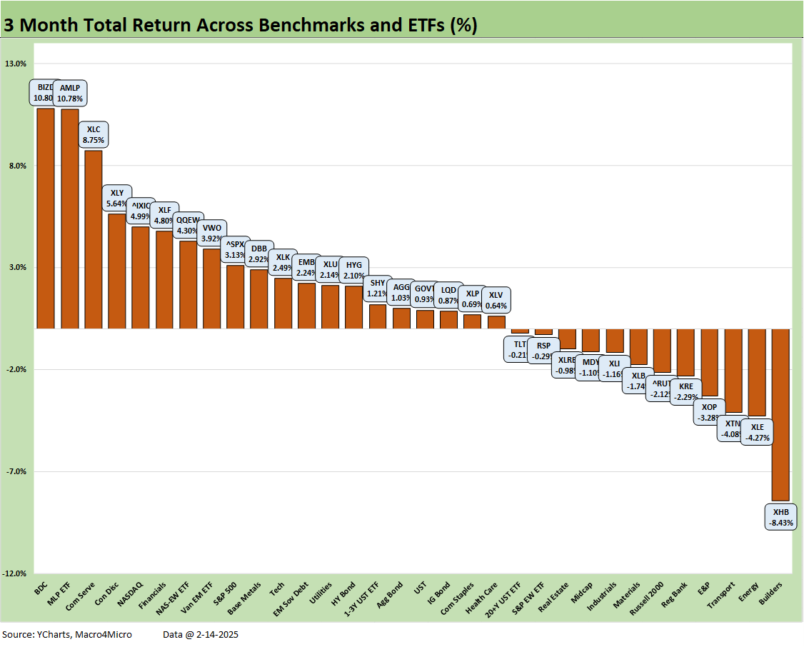 The winners were tech heavy at 4 of the 8 with Communications Services (XLC) at #1 and the Equal Weight NASDAQ 100 (QQEW) at #2, Tech (XLK) at #7 and NASDAQ at #8. Also cracking the top tier were Financials (XLF) and the high-income BDC ETF (BIZD). The recent UST rally and cyclical confusion with tariffs likely to have lifted the defensive Consumer Staples ETF (XLP) into the top quartile along with EM Equities (VWO), which is often wagged by the UST curve.