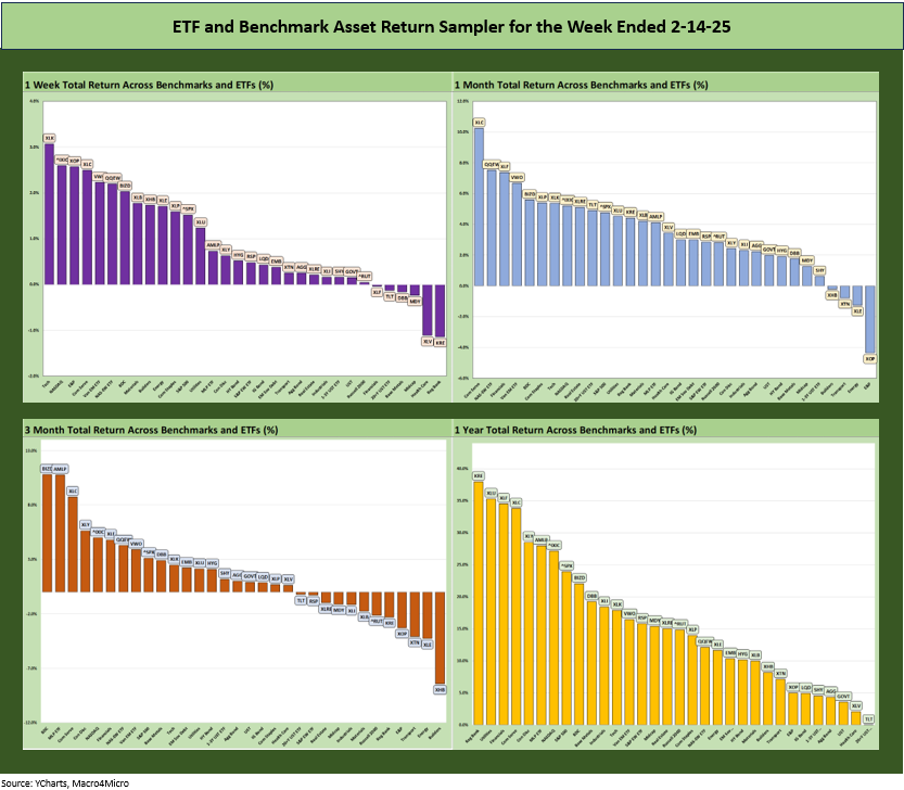 In the next section, we get into the details of the 32 ETFs and benchmarks for a mix of the trailing periods. Below we offer a condensed 4-chart view for an easy visual on how the mix of positive vs. negative returns shape up. This is a useful exercise we do each week looking for signals across industry groups and asset classes.
