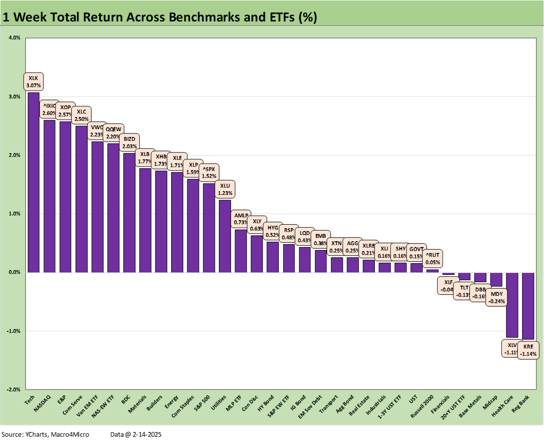 A positive week for equities (9 of 11 S&P 500 sectors positive, 26-6 score on our 32 benchmarks and ETFs) and very slight rally in the UST despite the CPI numbers made for interestingly muted results set against a week of tariff uncertainty and some geopolitical shockers for allies (former or otherwise).