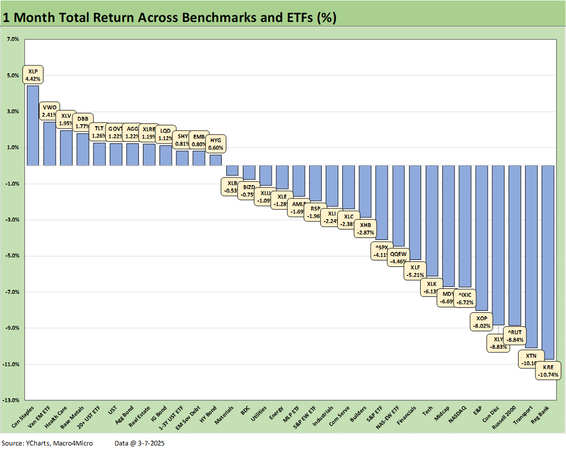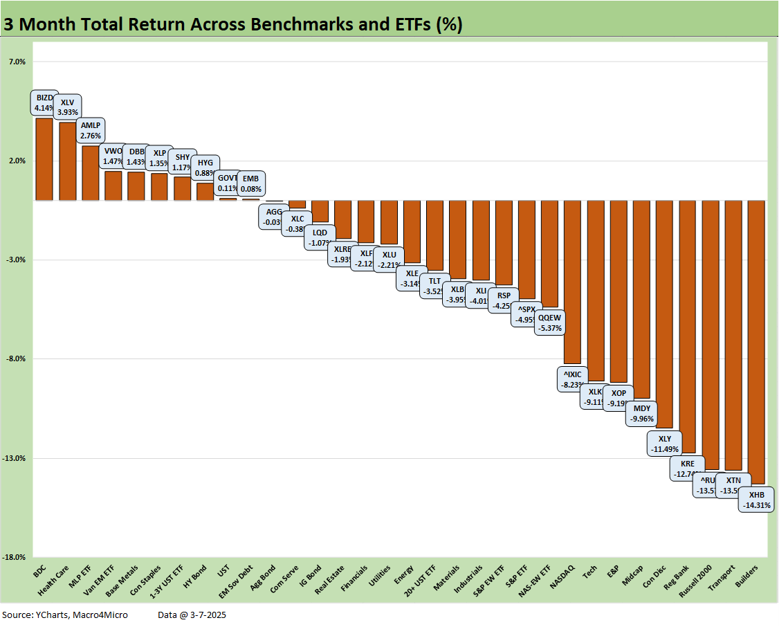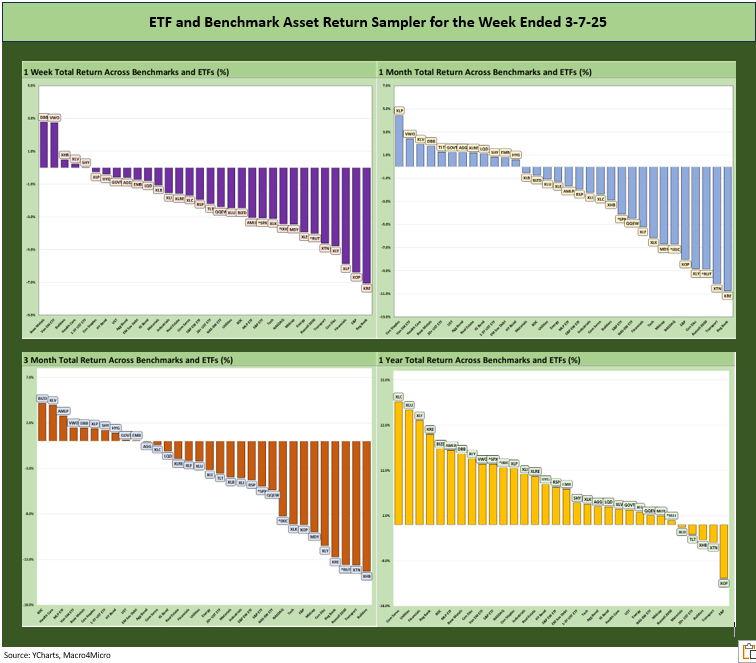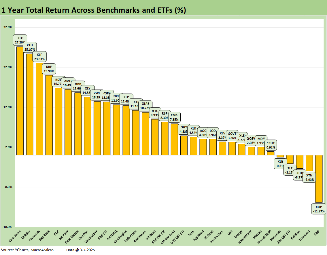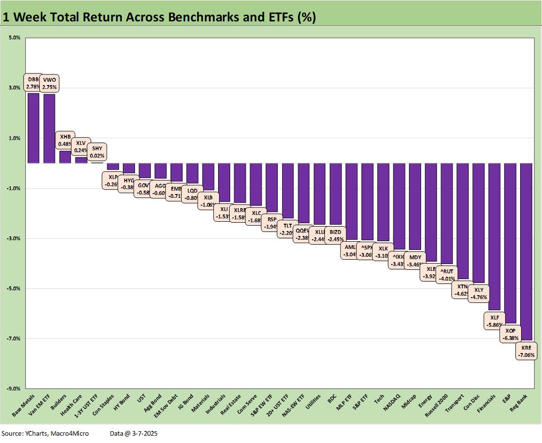 The 1-week return mix did not hold much mystery at a score of 5-27 as already detailed (see Mini Market Lookback: Tariffs Dominate, Geopolitics Agitate 3-8-25). This week showed Financials (XLF) and Regional Banks (KRE) taking a hit. The E&P ETF (XOP) is easily explained by oil prices tanking and more weakness expected. The cyclical anxiety is reflected in the bottom quartile with Transports (XTN) and Russell 2000 (RUT) and Midcaps (MDY).