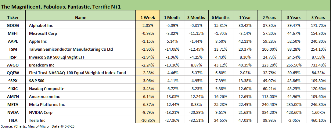 We looked at the tech bellwethers in the Mini Market Lookback: Tariffs Dominate, Geopolitics Agitate (3-8-25), and the trend is no mystery with returns overwhelmingly negative for the week at 1 positive (Alphabet), 1 positive over the 1-month period (Apple) and 2 positive over 3-months (Broadcom, Meta).