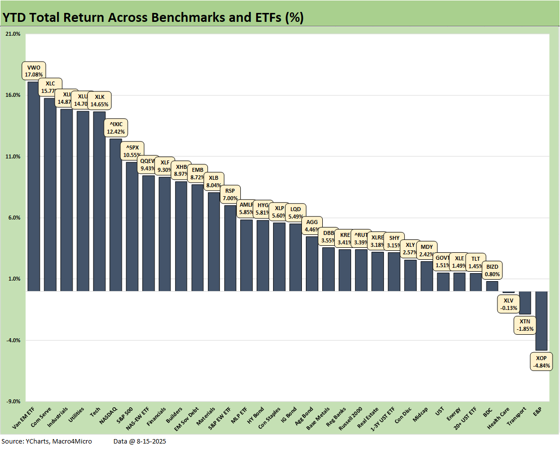 The top quartile sees a healthy tech-centric mix and some Mag 7 heavy ETFs along with a promising rally from the Russell 2000 after a period of weak performance for small caps YTD. The bottom of the rankings includes only 3 negative ETFs with two in Energy (XOP, XLE) and BDCs (BIZD) on the bottom.