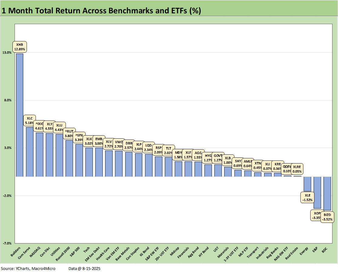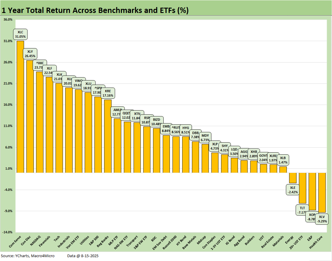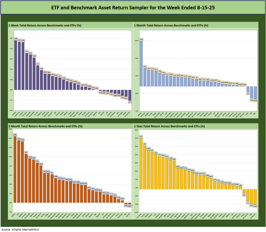 The 1-week returns were already covered in our Mini Market Lookback: Rising Inflation, Steady Low Growth? (8-16-25) with 23 positive, 8 negative and 1 ETF (AGG) at zero.