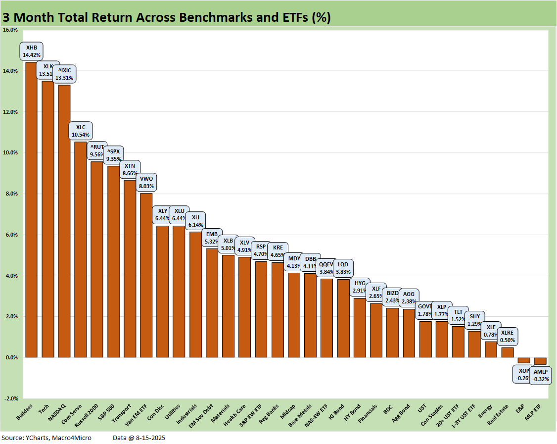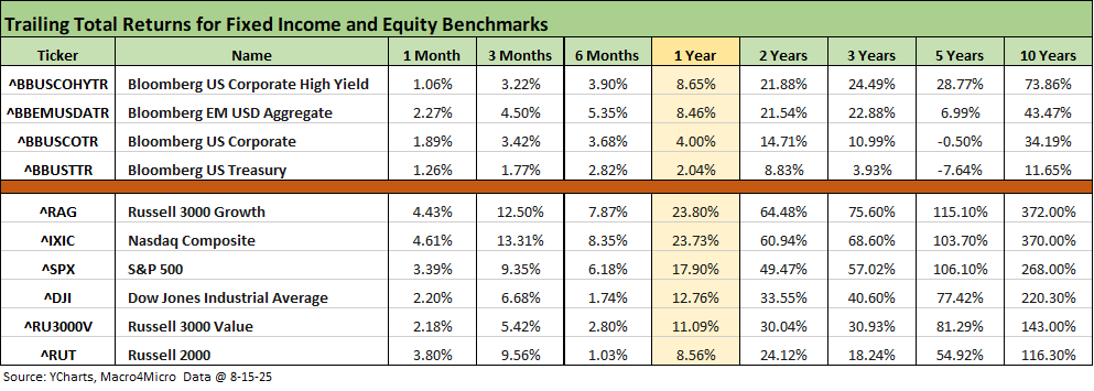 The 1-month equity numbers are mostly better (4 of 6) but with all 6 equity index lines positive for 1-month vs. 3 negative last week. The 3-month equity returns reflect the strong rebound off of the Liberation Day plunge.