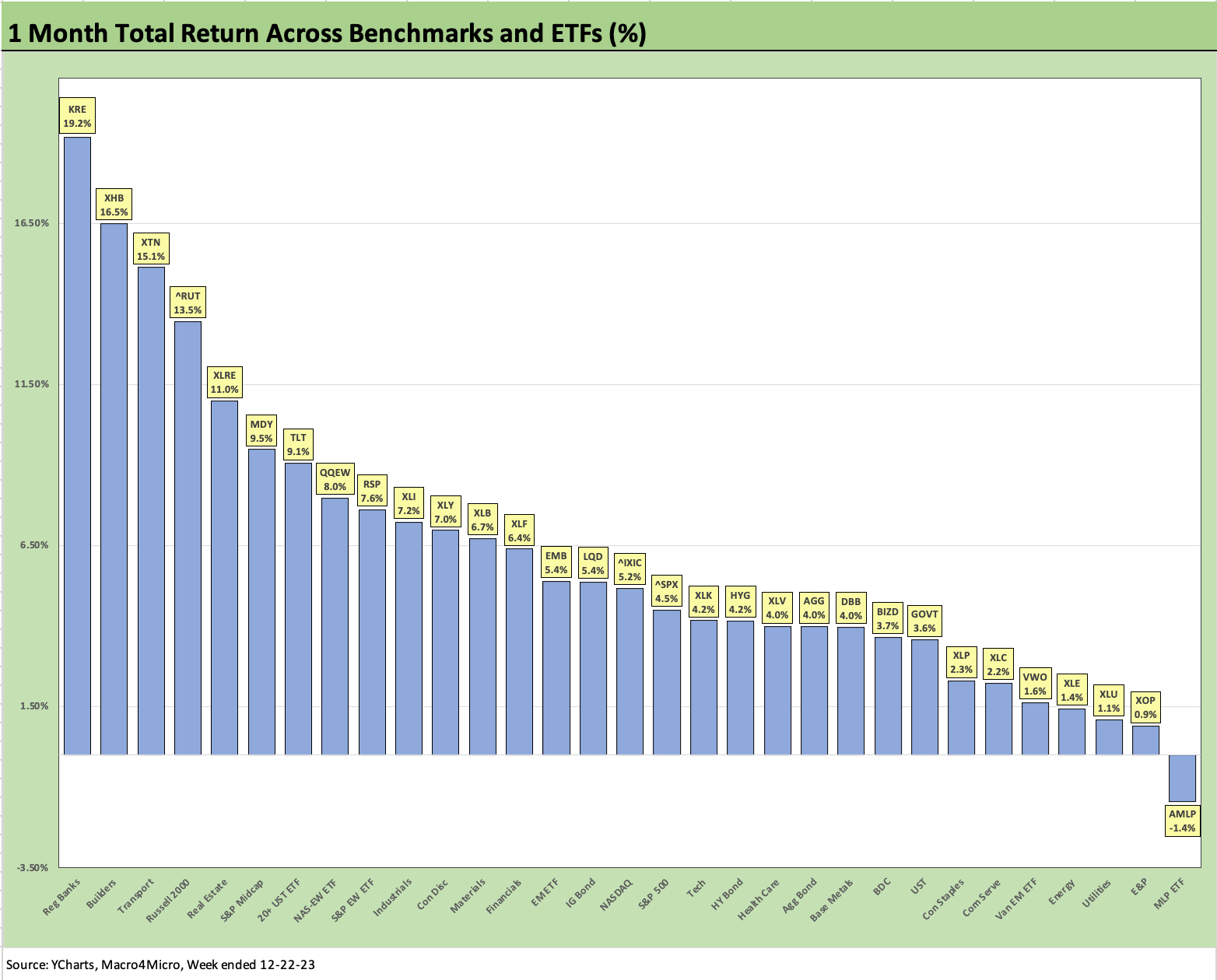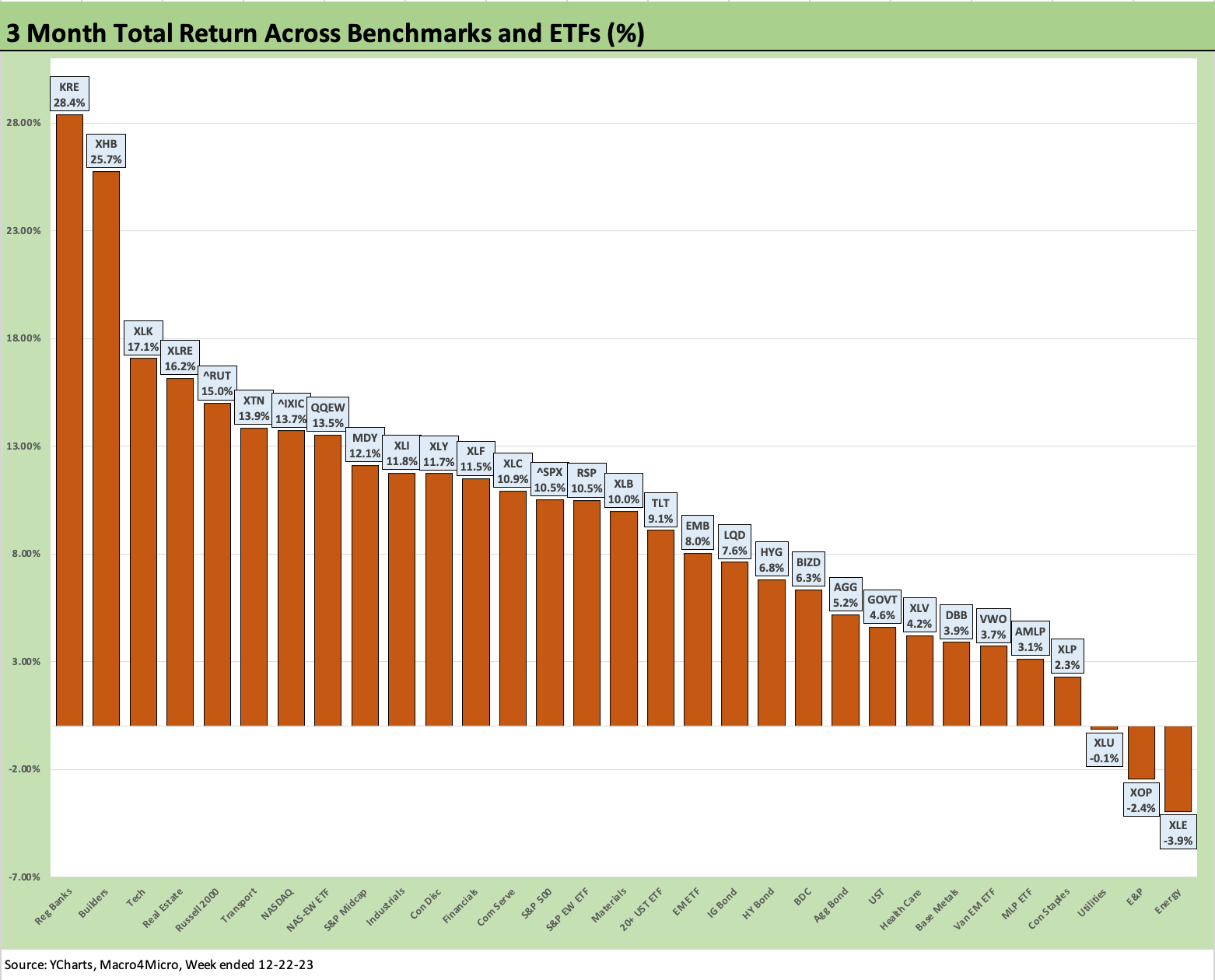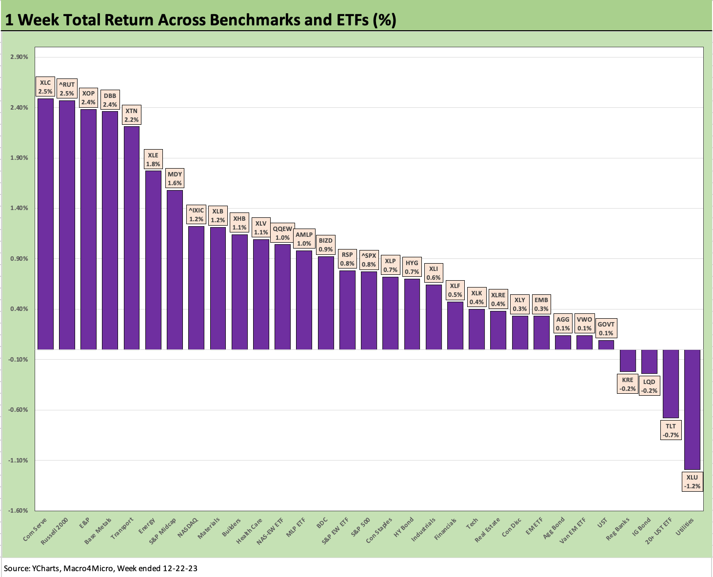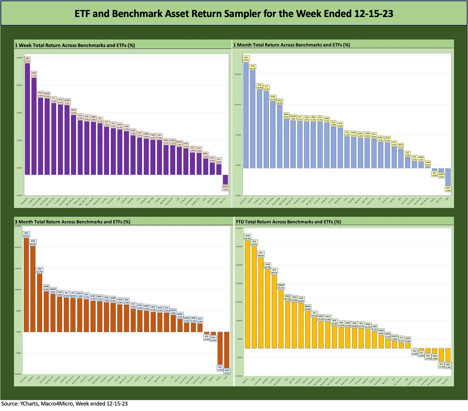 The 1-week return numbers are winding down with a flourish at 27 positive and 4 negative. We see some of the recent laggards in energy (XOP, XLE) and base metals (DBB) and small caps continuing an impressive close to the year after running from negative YTD in Oct 2023. Russell 2000 has moved all the way to +17.3% YTD to end last week. That is over a 20-point swing since late Oct after +13.5% for the trailing month and +15% for the rolling 3 months. Russell 2000 has a more US-centric profile that many take as a useful indicator for US cyclical sentiment.