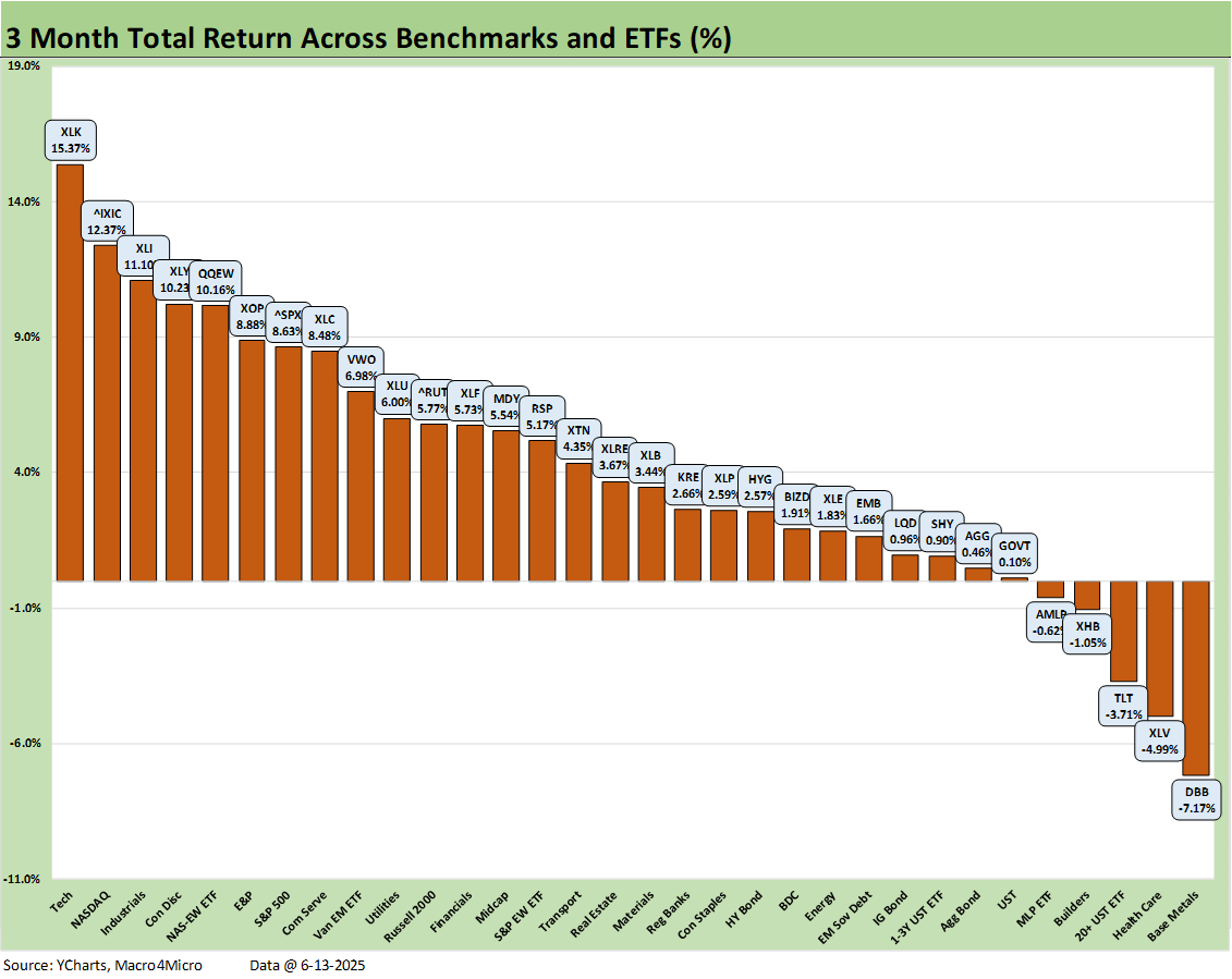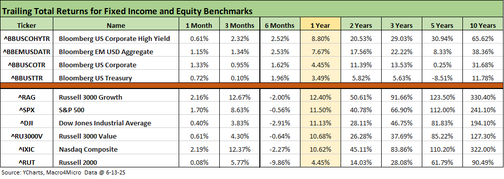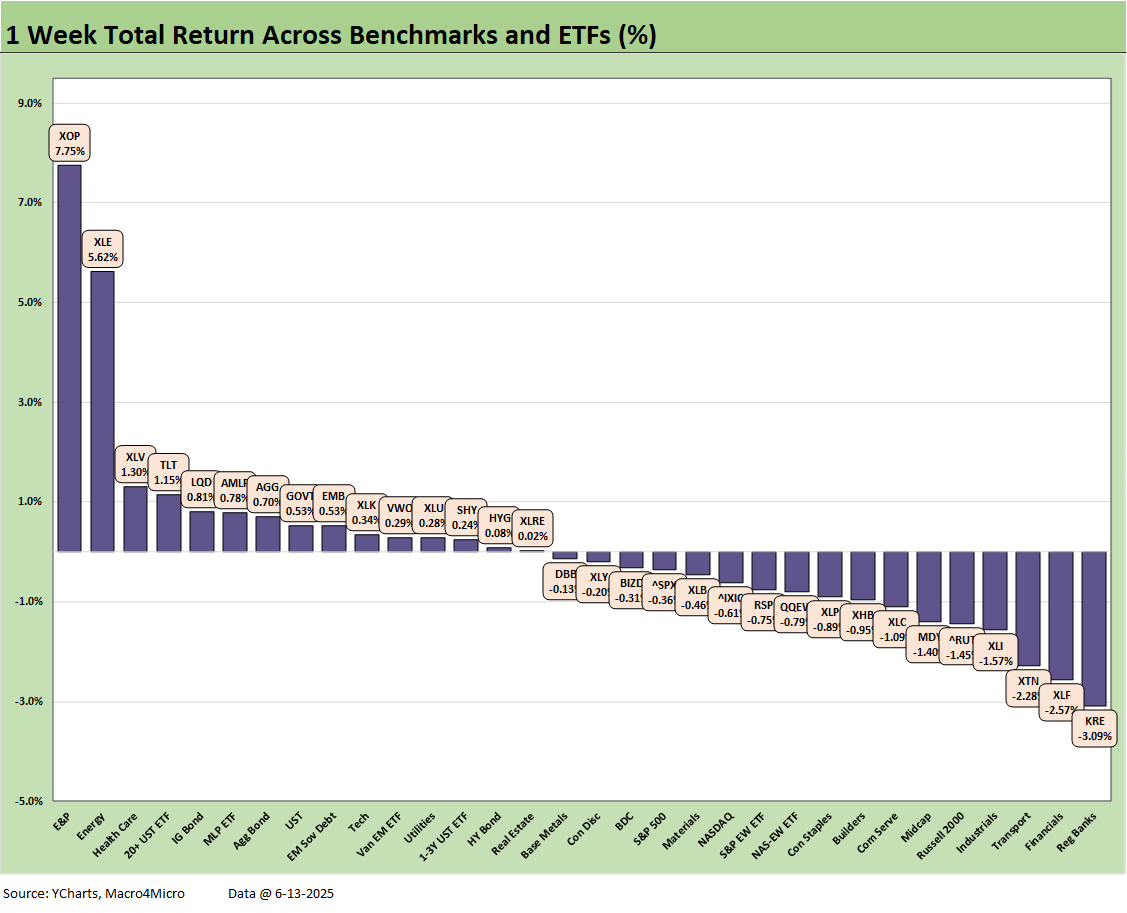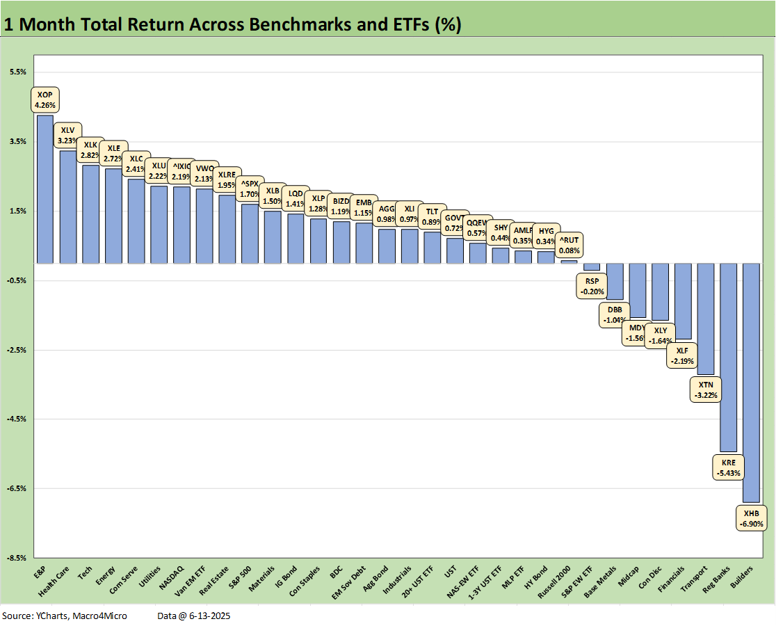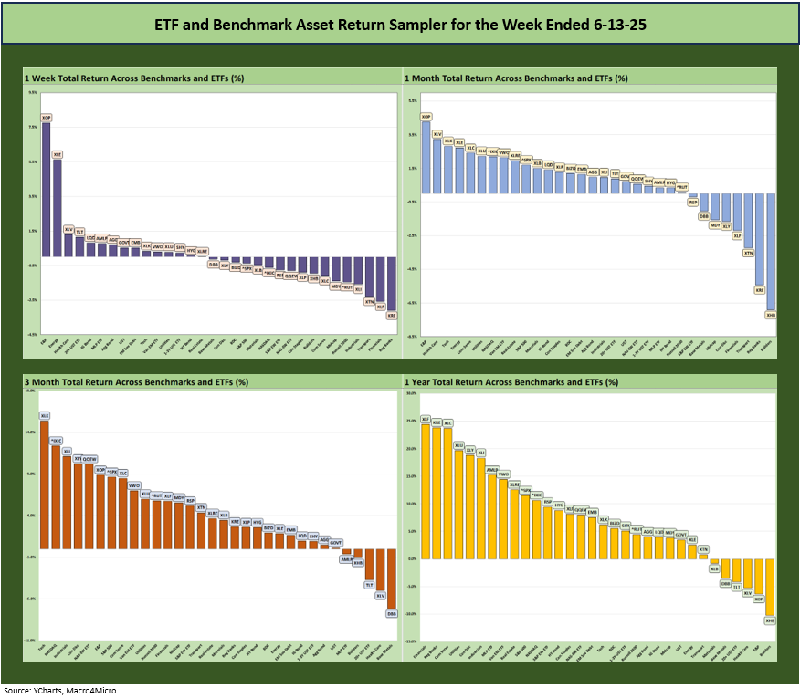 We reviewed some of the moving parts already in Mini Market Lookback: Deus Vult or Deus Nobis Auxilium (6-14-25), and it was quite a week for headlines. The net asset price moves across the trailing week was mild given the potential risks of the Middle East action. The 4 major benchmarks were negative for the week but with energy ETFs soaring. That feeds into trailing the trailing 1-month and 3-month periods that are back to all positive for the high-level debt and equity benchmarks we track in the above table each week.