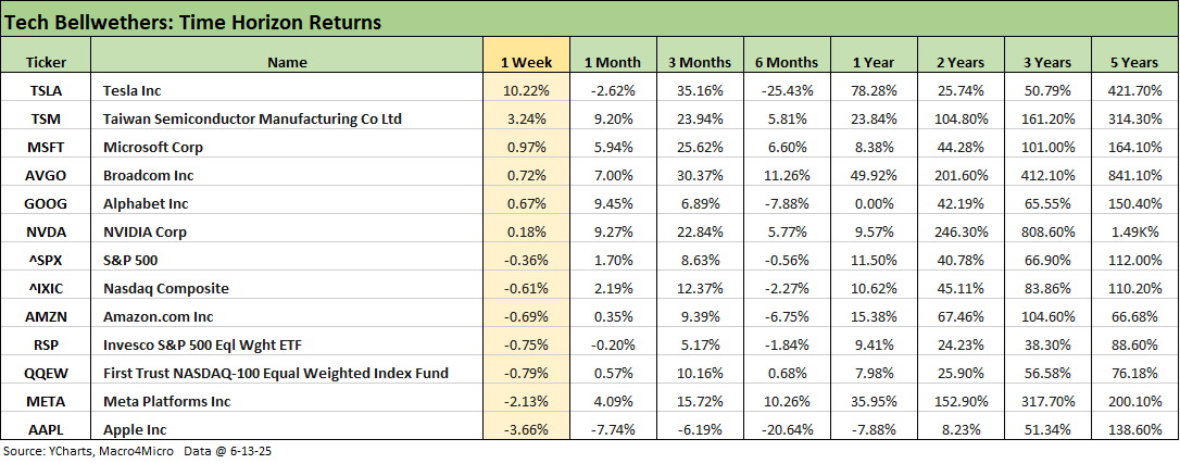 We looked at the tech bellwethers already in Mini Market Lookback: Deus Vult or Deus Nobis Auxilium (6-14-25) with 4 of the Mag 7 positive on the week and 5 of 7 positive for the 1-month. It is notable that the NASDAQ and equal weighted NASDAQ 100 ETF (QQEW) were in the red for the week. Tesla is mounting a comeback at +10% on the week, but it remains at -2.6% for 1 month and -25.4% at 6 months. The always-volatile TSLA is +35.2% for 3 months and +78.5% for one year.
