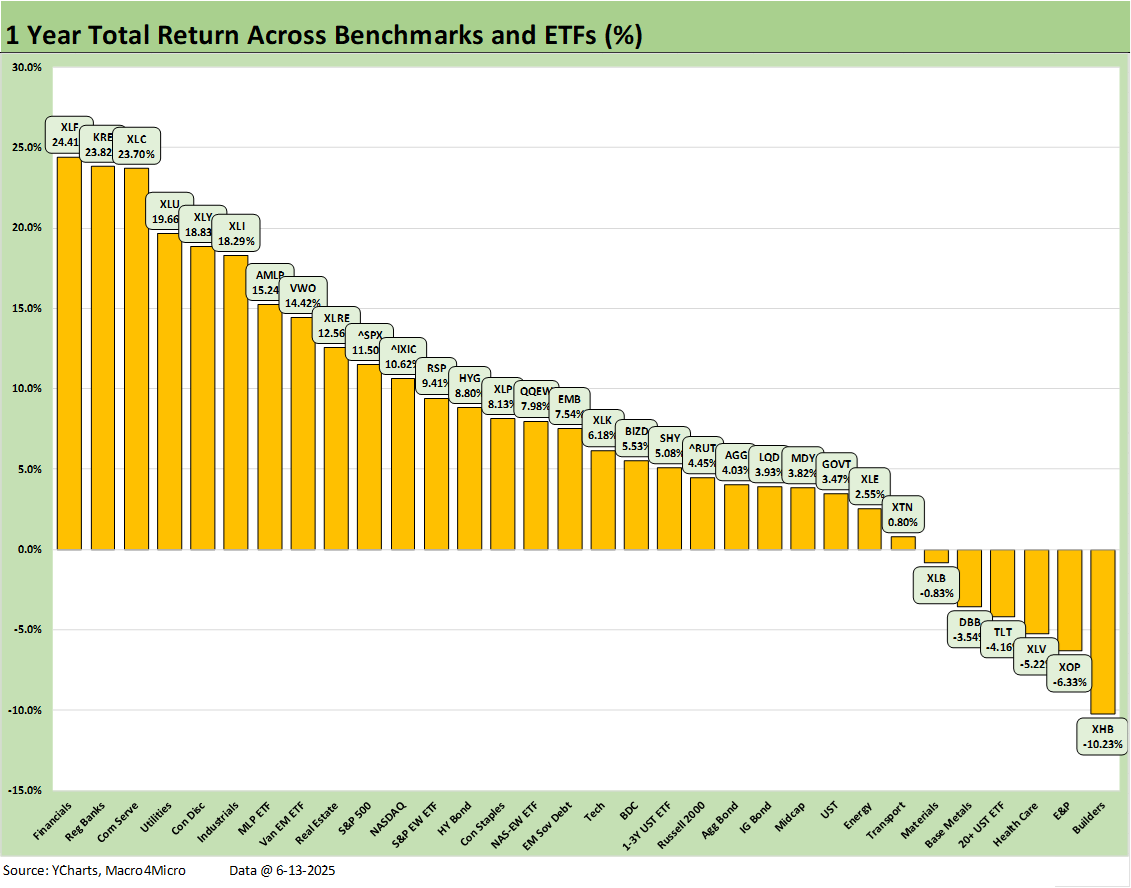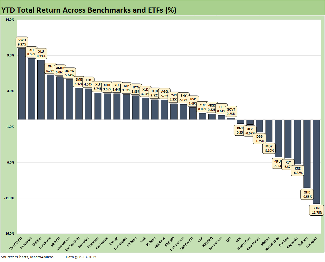 The winners YTD include EM Equities (VWO) at #1, Industrials (XLI), Utilities (XLU), Communications Services (XLC), and Midstream Energy (AMLP) in the Top 5. Those sectors have recurring themes that worked around the worst of the tariff threats except for the large cap industrials in the XLI bucket. The major industrials have more flexibility than small cap and mid cap manufacturers, and that will get put to the test across the 3Q25 period.