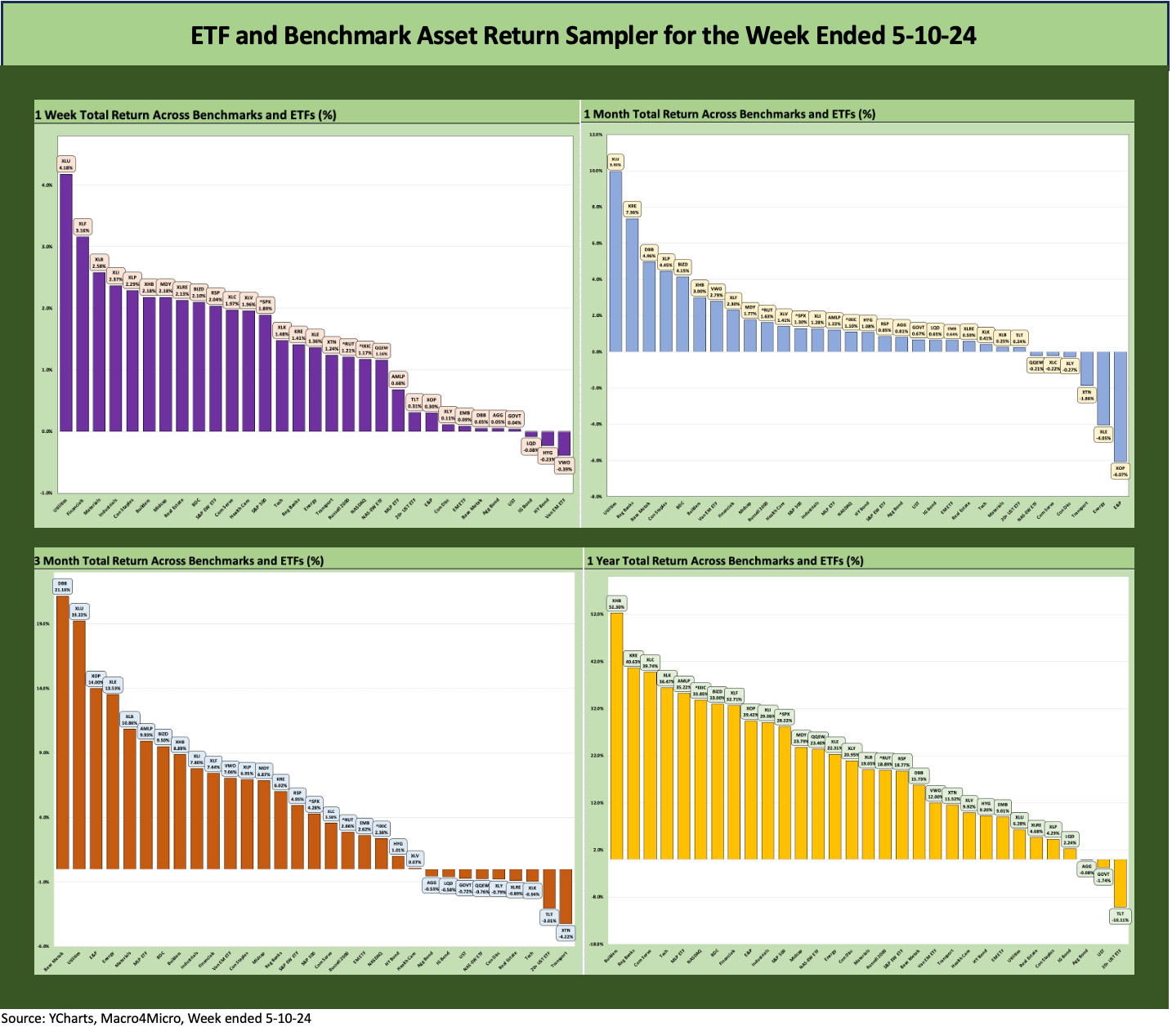In the next section we get into the details of the 31 ETFs and benchmarks for trailing periods. Below we offer a condensed 4-chart view for an easy visual before we break out each time period in the commentary further below. This is a useful exercise we do each week for signals across industry groups and asset classes.