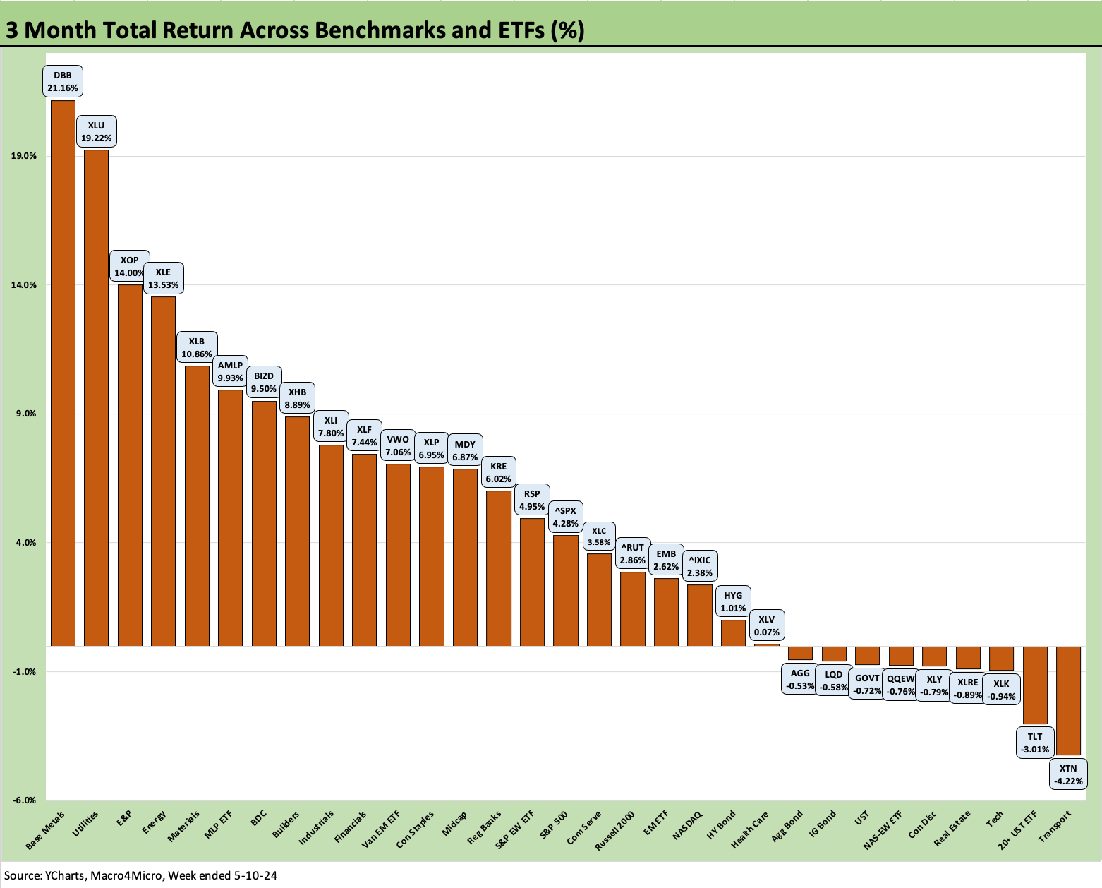 The above chart frames the trailing 1-week returns for the 31 line items. We see a score of 28-3 positive with 2 of the 3 negative being bond ETFs (LQD and HYG) on a small adverse UST move inside 10 years and a slight spread widening of 4 bps in HY.