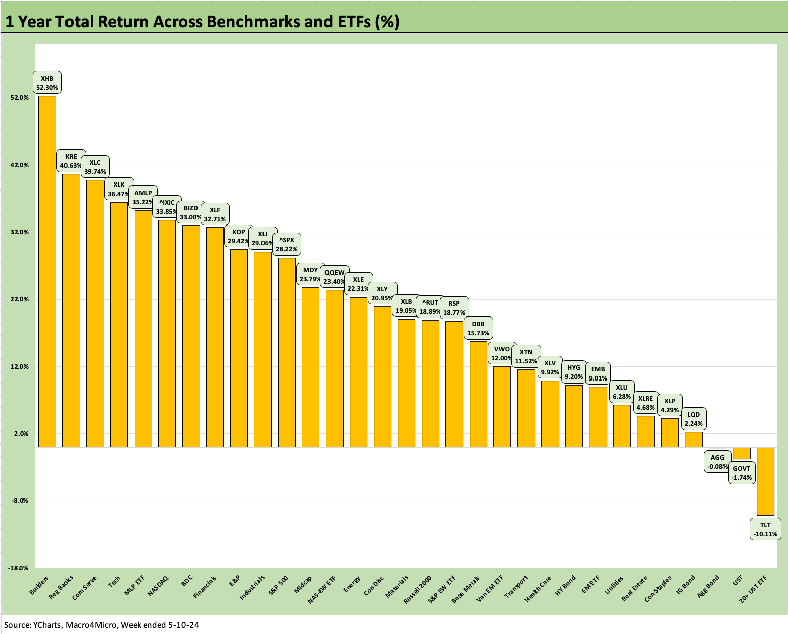 The trailing 1 year is still at 28-3 this week with the same 3 bond ETFs in the red zone. That about tells the story of the UST bull scenario of multiple cuts into 2H23 and 1H24. We see TLT on the bottom at -10.1% with GOVT and AGG at a distant second and third to last, respectively.
