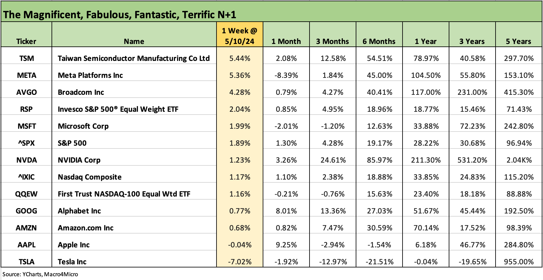 Taiwan Semiconductor took the lead this week on the list as a lot of excitement lies ahead for TSM and China-US trade politics heats up. We see Tesla taking another battering the past week that left TSLA negative in trailing time horizons all the way back to the trailing 3 years. Looking back 5 years, however, only NVDA has beaten TSLA. NVDA has crushed the group over 1 year and 3 years.