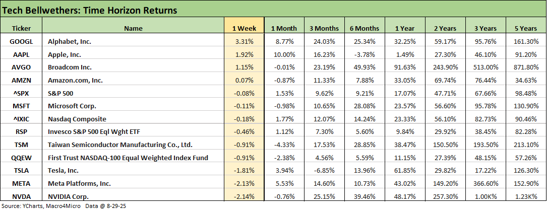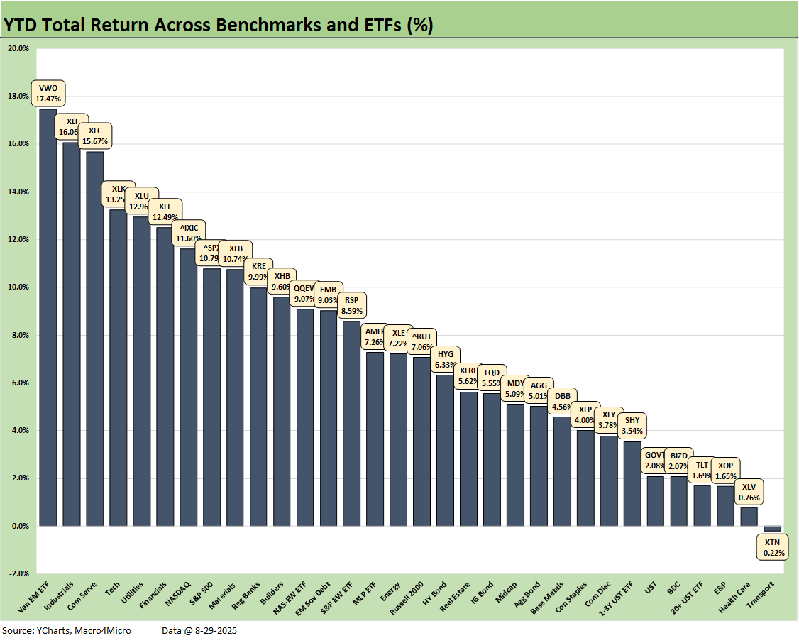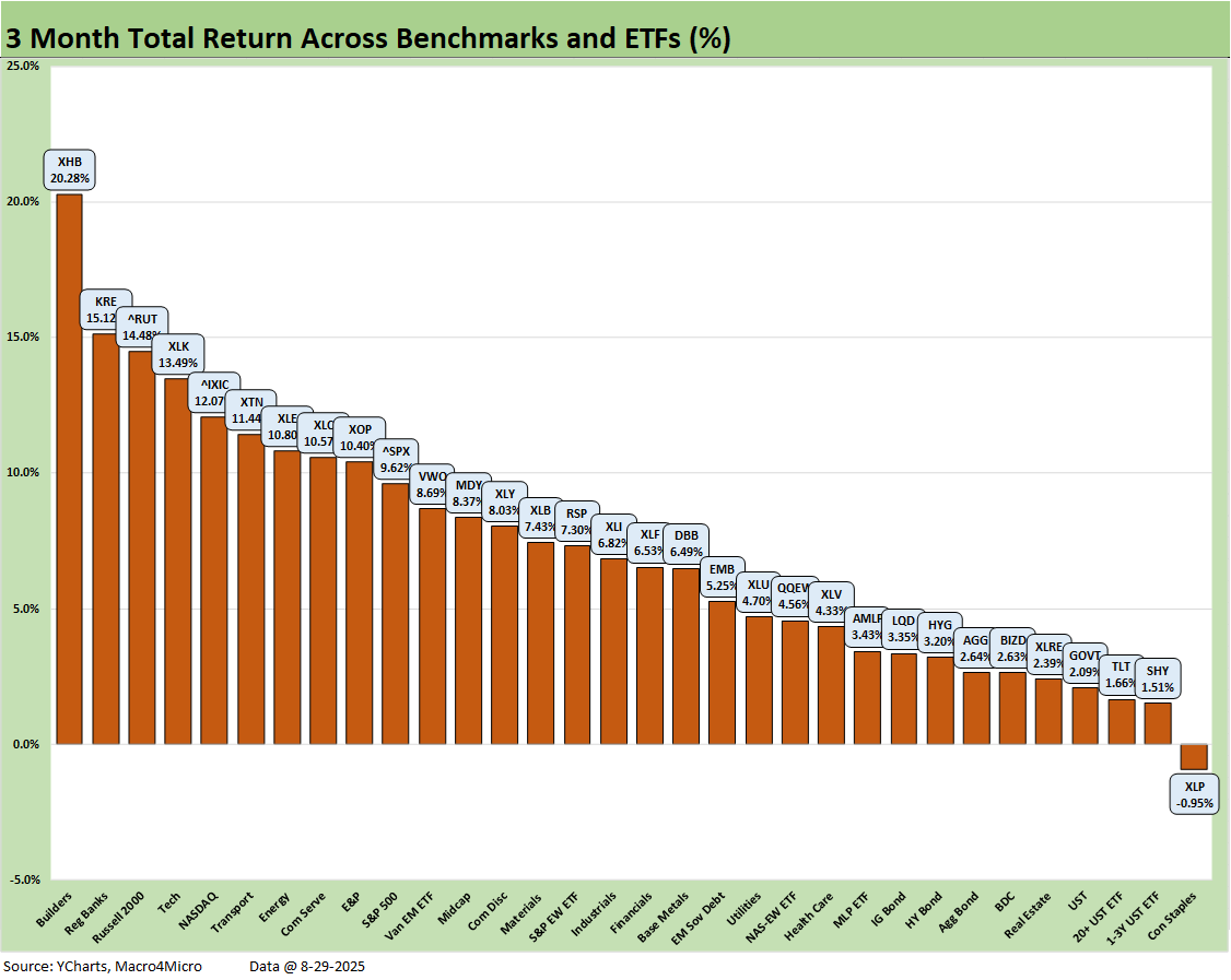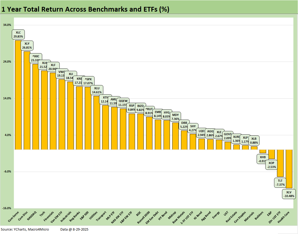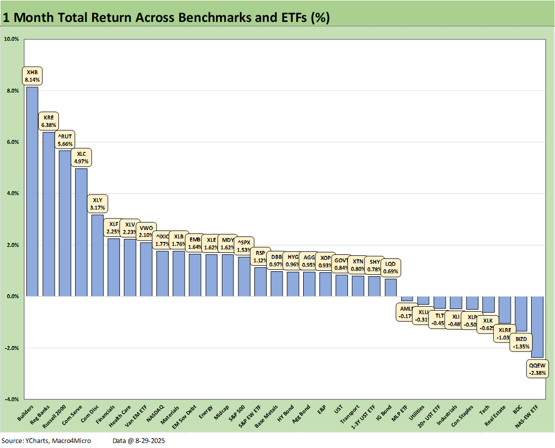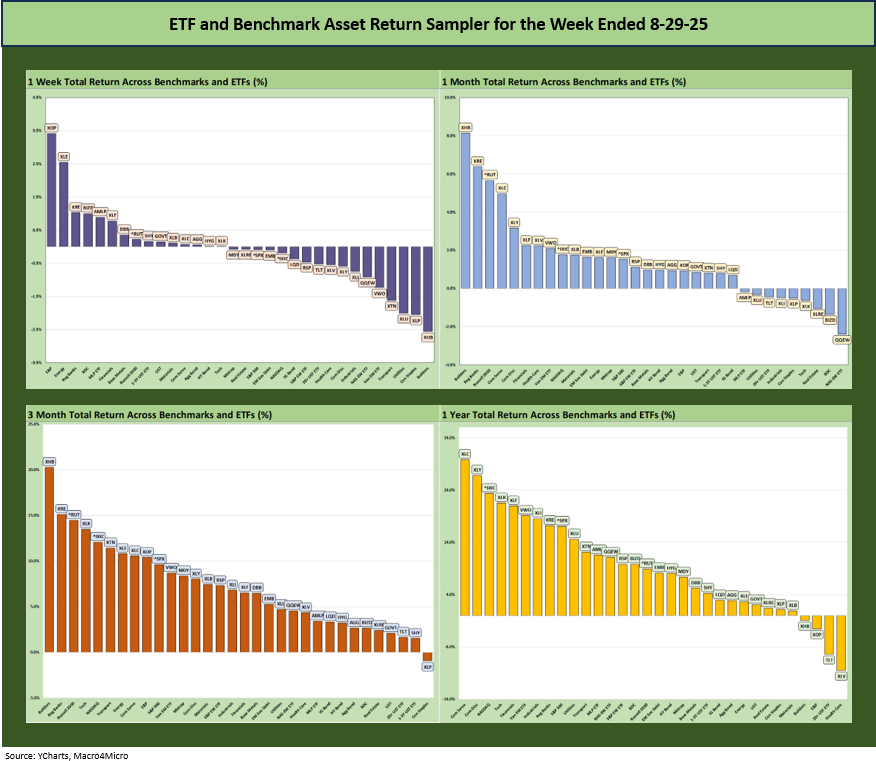 The 1-week returns across our 32 benchmarks and ETFs was addressed in our Mini Market Lookback: Tariffs Back on Front Burner (8-30-25). As noted earlier, the symmetry of the short-term returns had a rare moment of “leans negative” since the post-Liberation Day rebound.