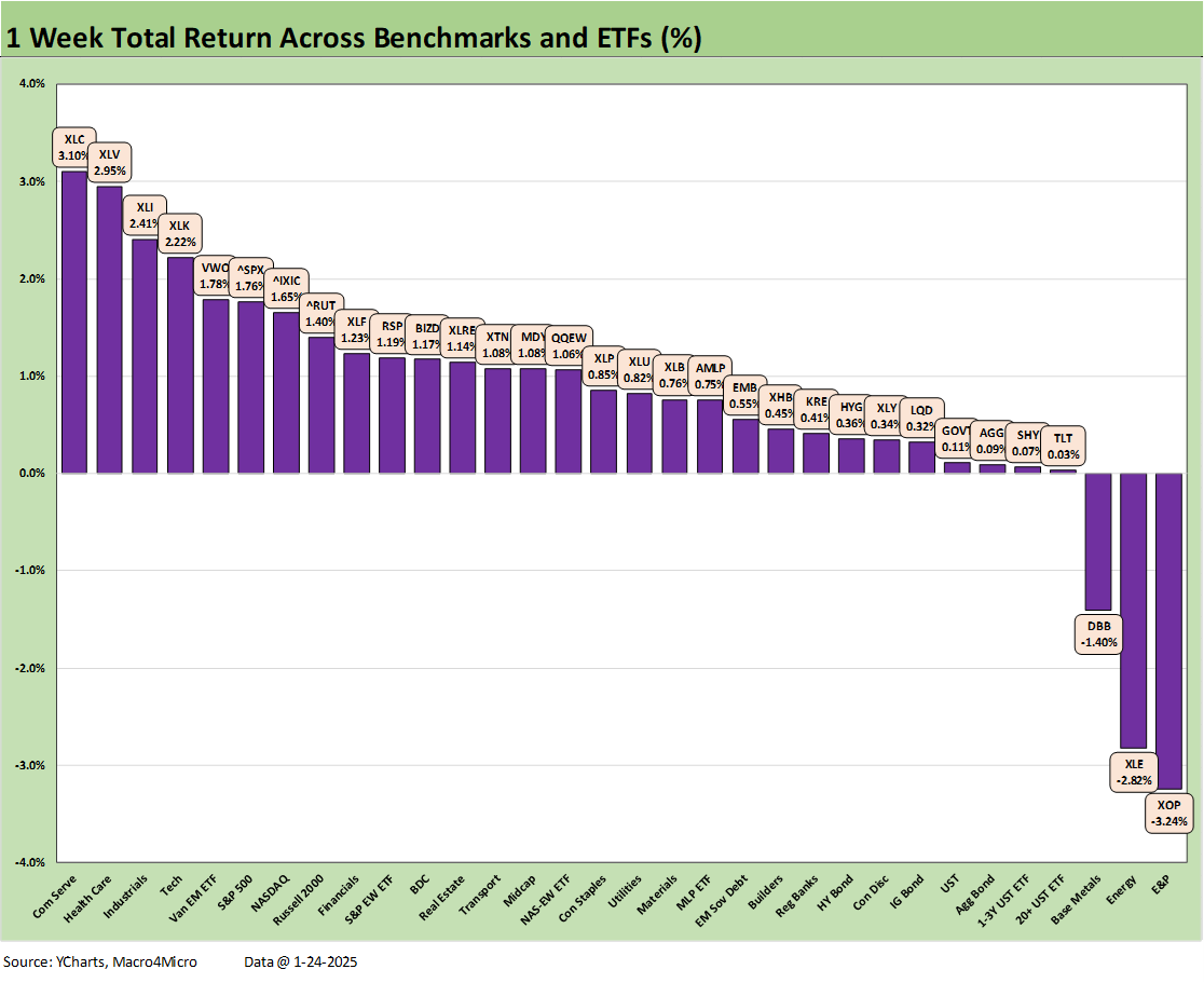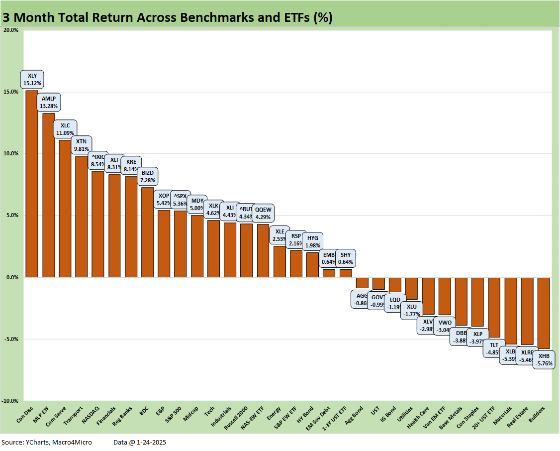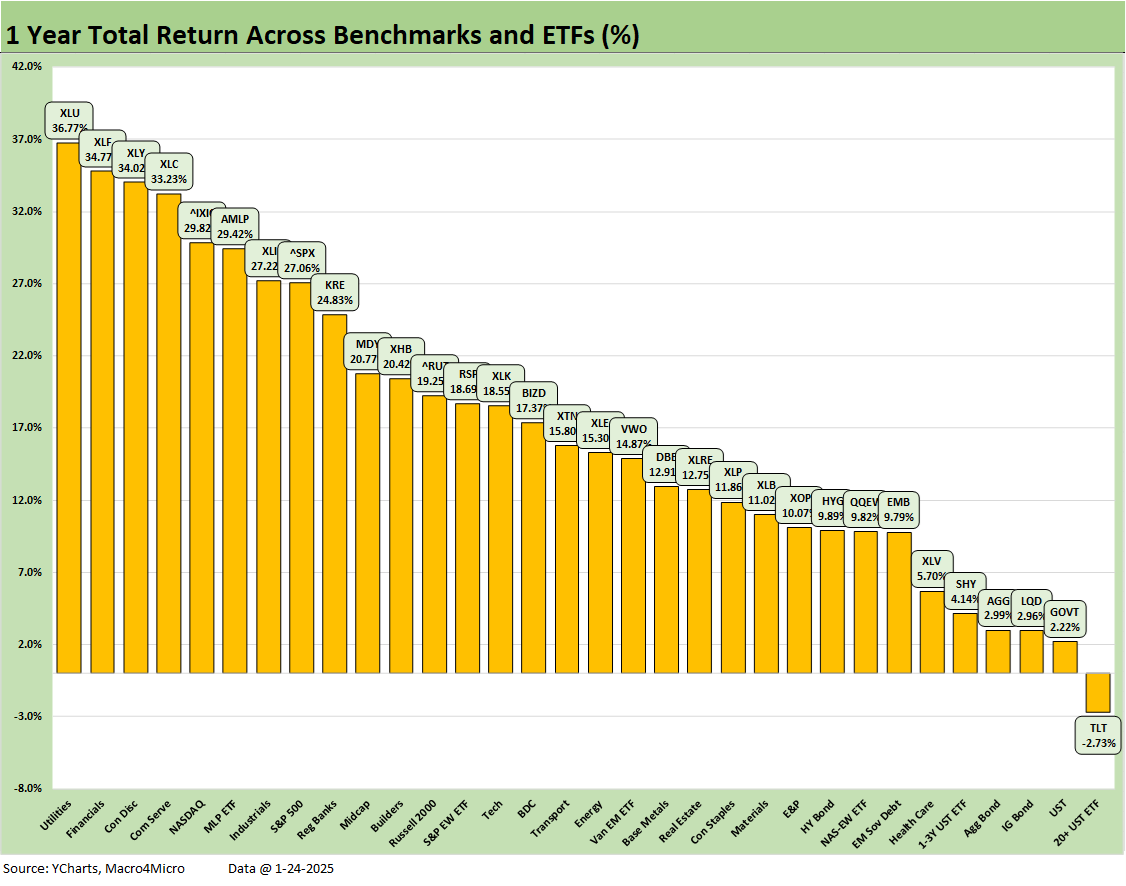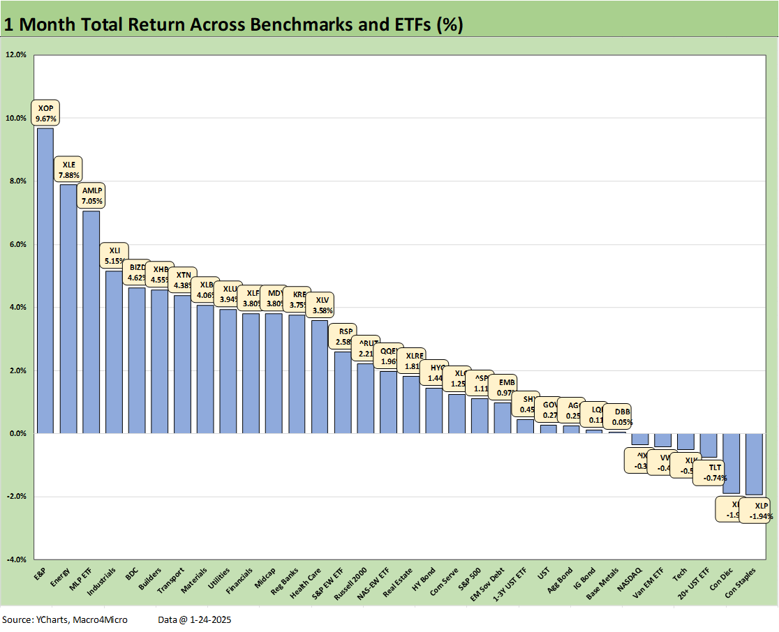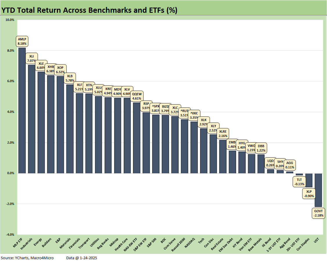 After a rough stretch in Dec 2024 for the UST curve, the UST volatility of Jan 2025 has been easier on total returns. The 10Y UST and bear steepener since the Sept 2024 lows included a near 100 bps unfavorable delta that has weighed on bond returns (see Mini Market Lookback: Policy Blitz Formation 1-25-25). We will look at those numbers in more detail in our Footnotes publication on the State of Yields that will be posted later today.