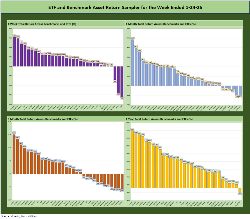In the next section, we get into the details of the 32 ETFs and benchmarks for a mix of the trailing periods. Below we offer a condensed 4-chart view for an easy visual on how the mix of positive vs. negative returns shape up. This is a useful exercise we do each week looking for signals across industry groups and asset classes. We also have a YTD version that we include in the broader commentary on the time horizons further below.