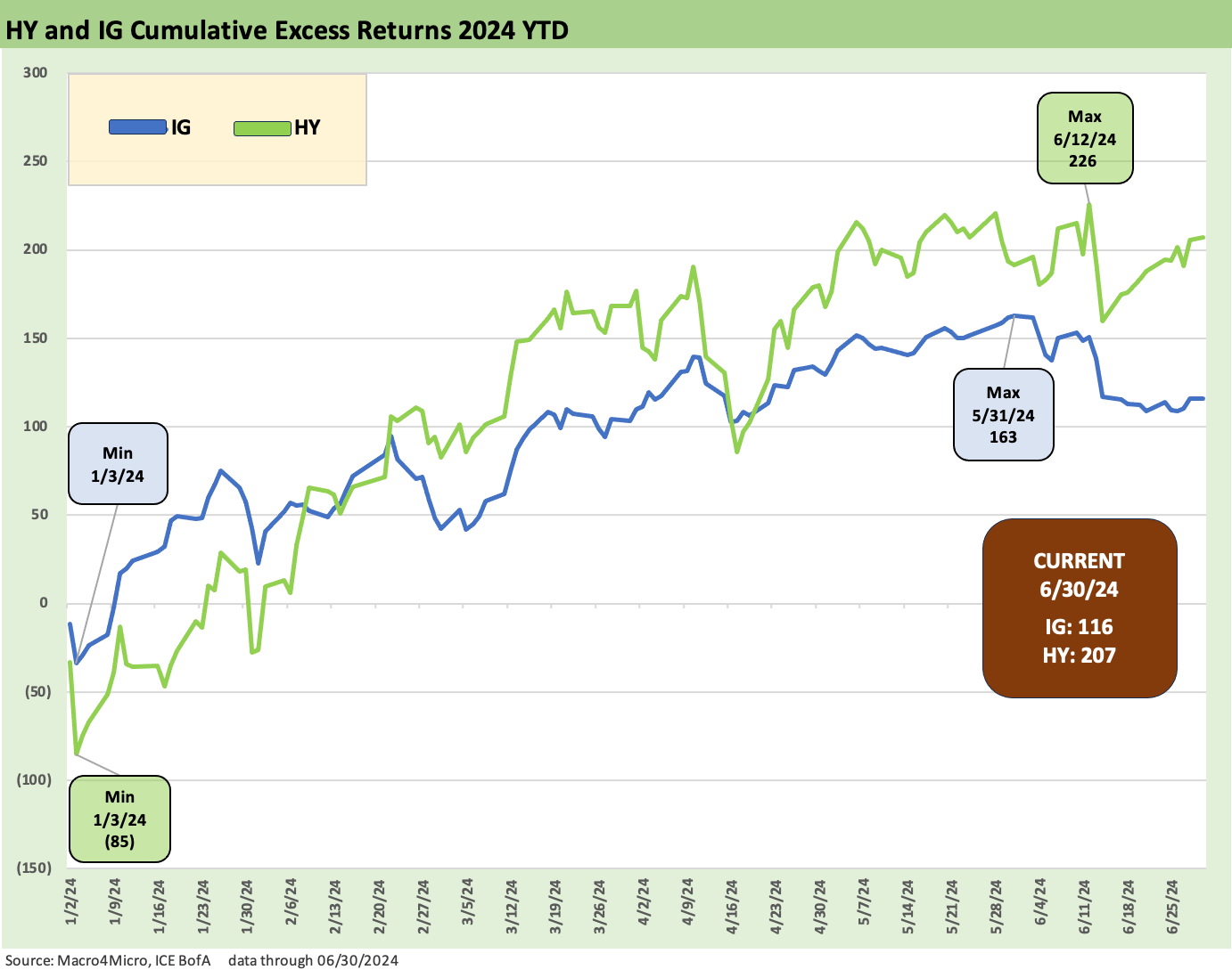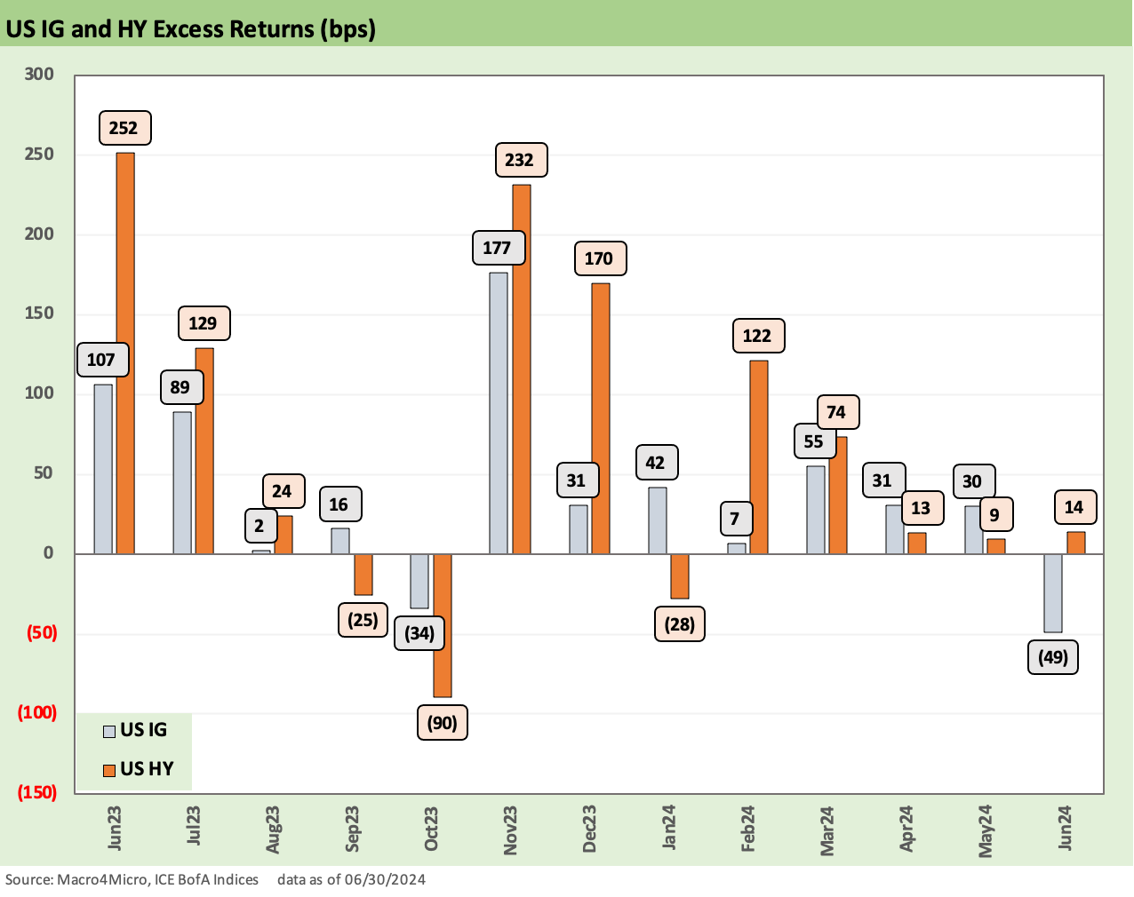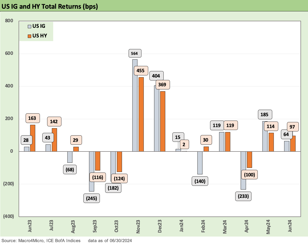 The above chart revisits the monthly timeline from June 2023 to June 2024 for total returns in IG Corporates and HY bonds. The pattern offers a reminder that the UST moves have dominated the story line in total returns across a period when handicapping the timeline to easing has been a daily focus. The monster rally in Nov-Dec 2023 stands out in the chart for the UST move away from the highs of late Oct 2023 (10-19-23).