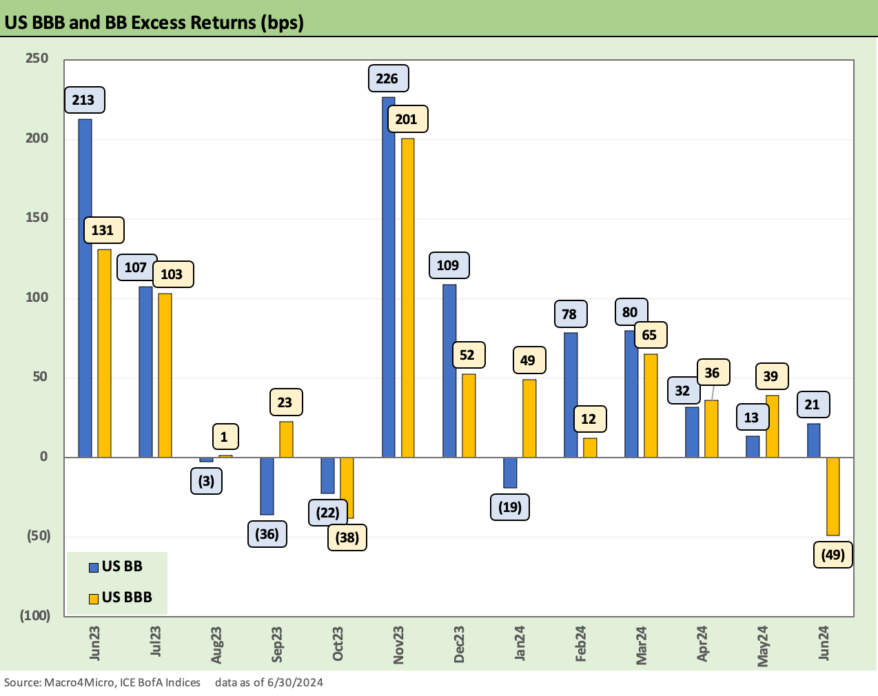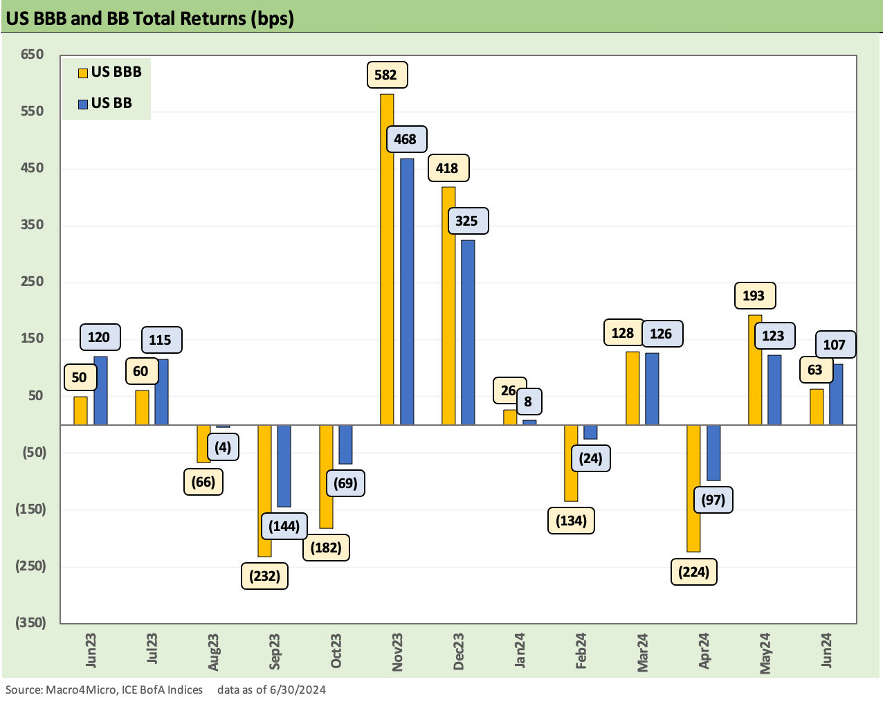 The above chart frames BBB total returns vs. BB, and the UST has been the main driver of the longer duration BBB tier (duration of 6.5 at 6-30-24) vs. the shorter duration BB tier (duration of 3.5). The big UST rally on Nov-Dec 2023 gave the BBB tier total return a nice lift even with BB OAS rallying also. The adverse 2024 YTD moves of the UST curve were not as kind as the strong finish to 2023.