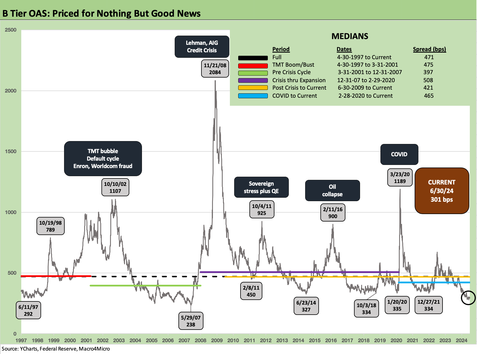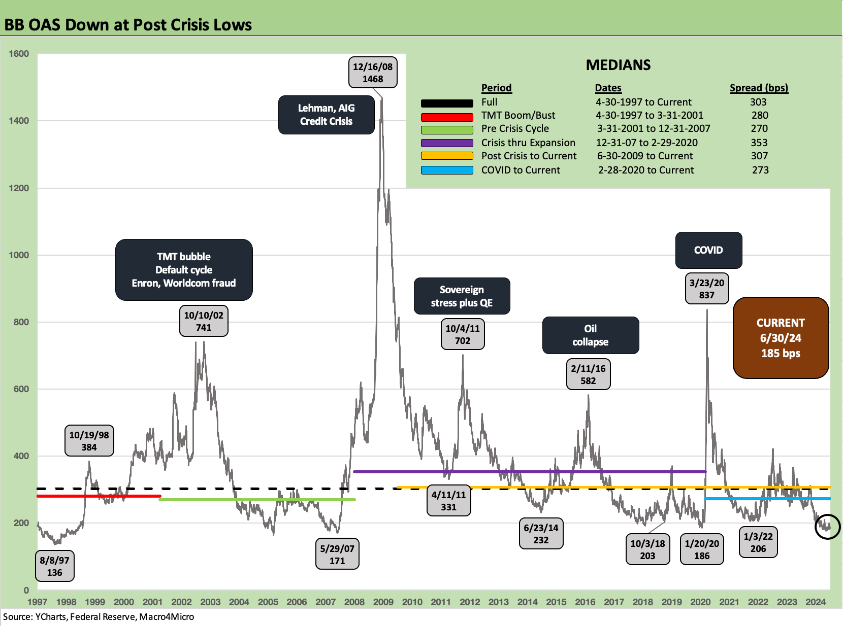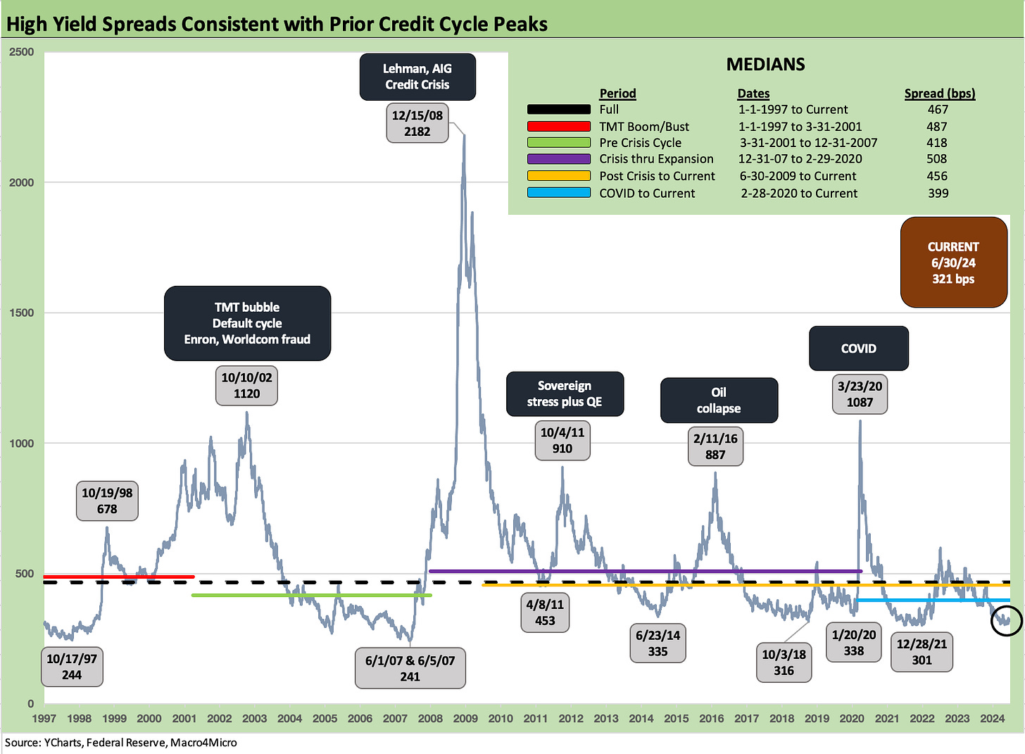 From a midyear starting point as of July 2024, credit spreads are anything but compelling at this point. We look at those histories in other charts, but the fact remains that the OAS to wrap midyear was more in line with past credit peaks such as late 1997 and mid 2007 among the pre-crisis peaks and June 2014 and Oct 2018 in the post-crisis ZIRP and mild normalization periods. Spreads are tight, plain and simple, but have held in very well after an especially strong rally to wrap 2023 in Nov-Dec (see HY Spreads: Celebrating Tumultuous Times at a Credit Peak 6-13-24).