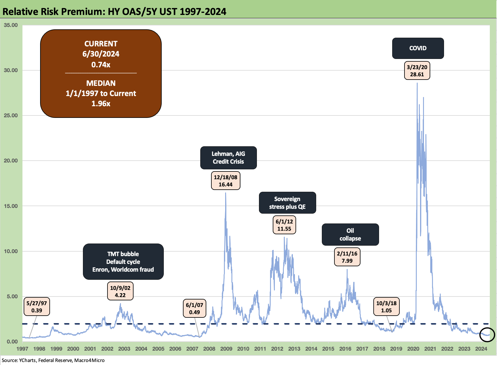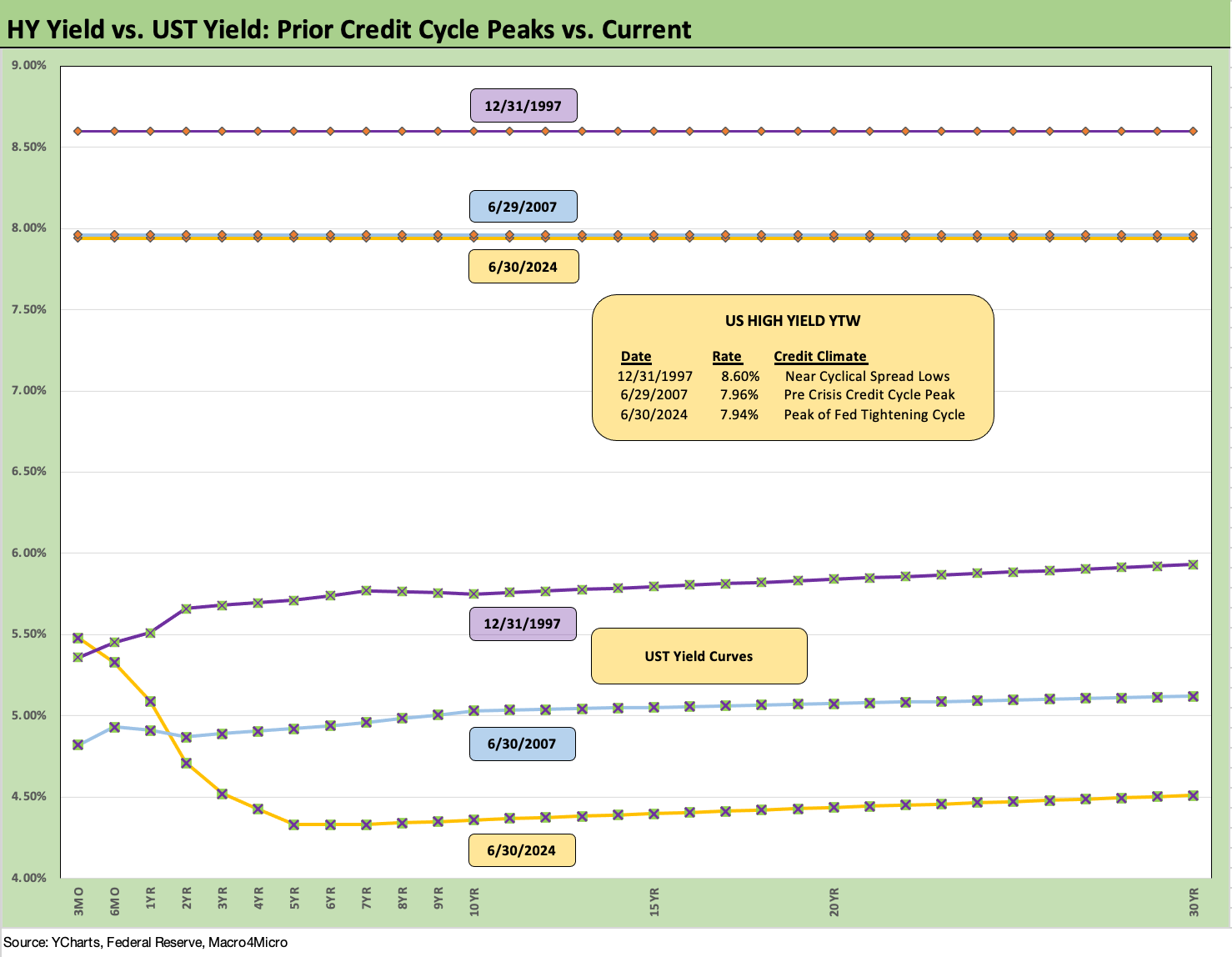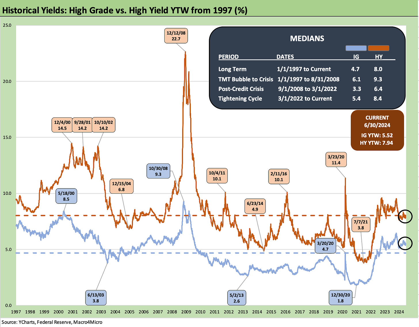 Using that rationale, the current yields of 5.52% for IG and 7.94% can be stacked up against 6.1% in HY and 9.3% in IG. Considering that spreads are very compressed and UST rates below the rates of earlier credit cycle peaks, those comparisons make more sense than comparing to a ZIRP and QE or minimal rates world seen from late 2008 through the early stages of the current tightening cycle. The current UST rate backdrop is quite low in the broader multicycle context against non-ZIRP periods (see Footnotes & Flashbacks: State of Yields 6-30-24).