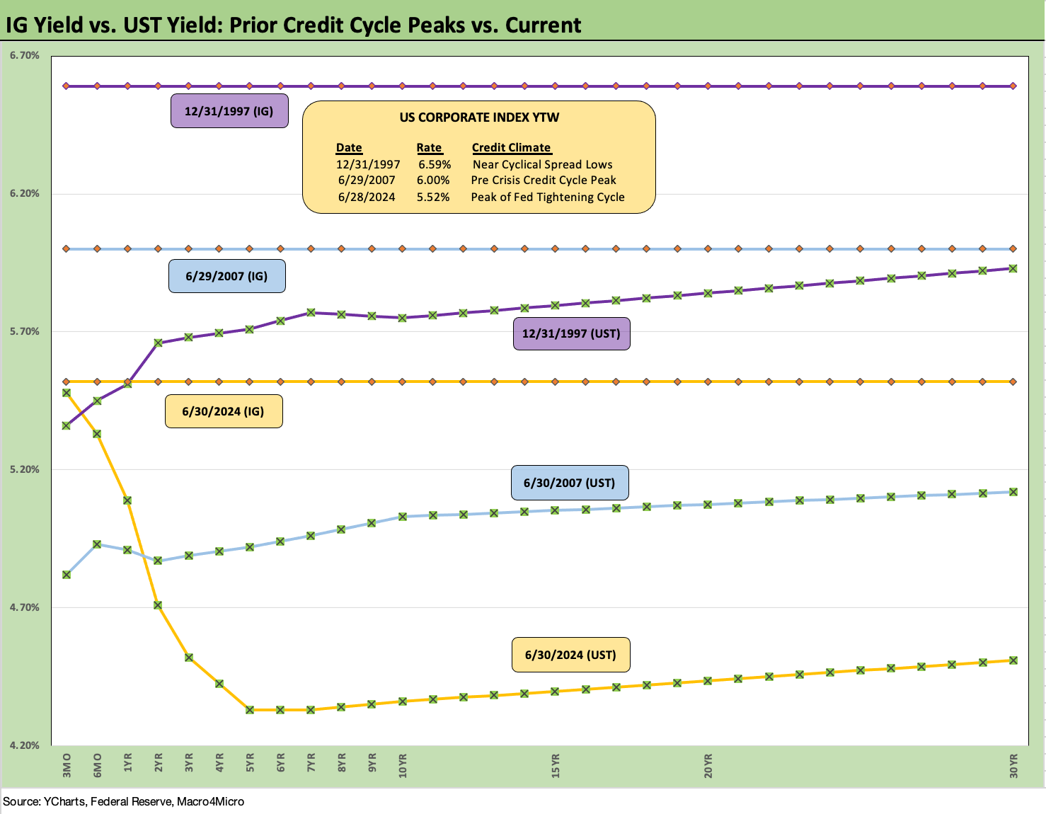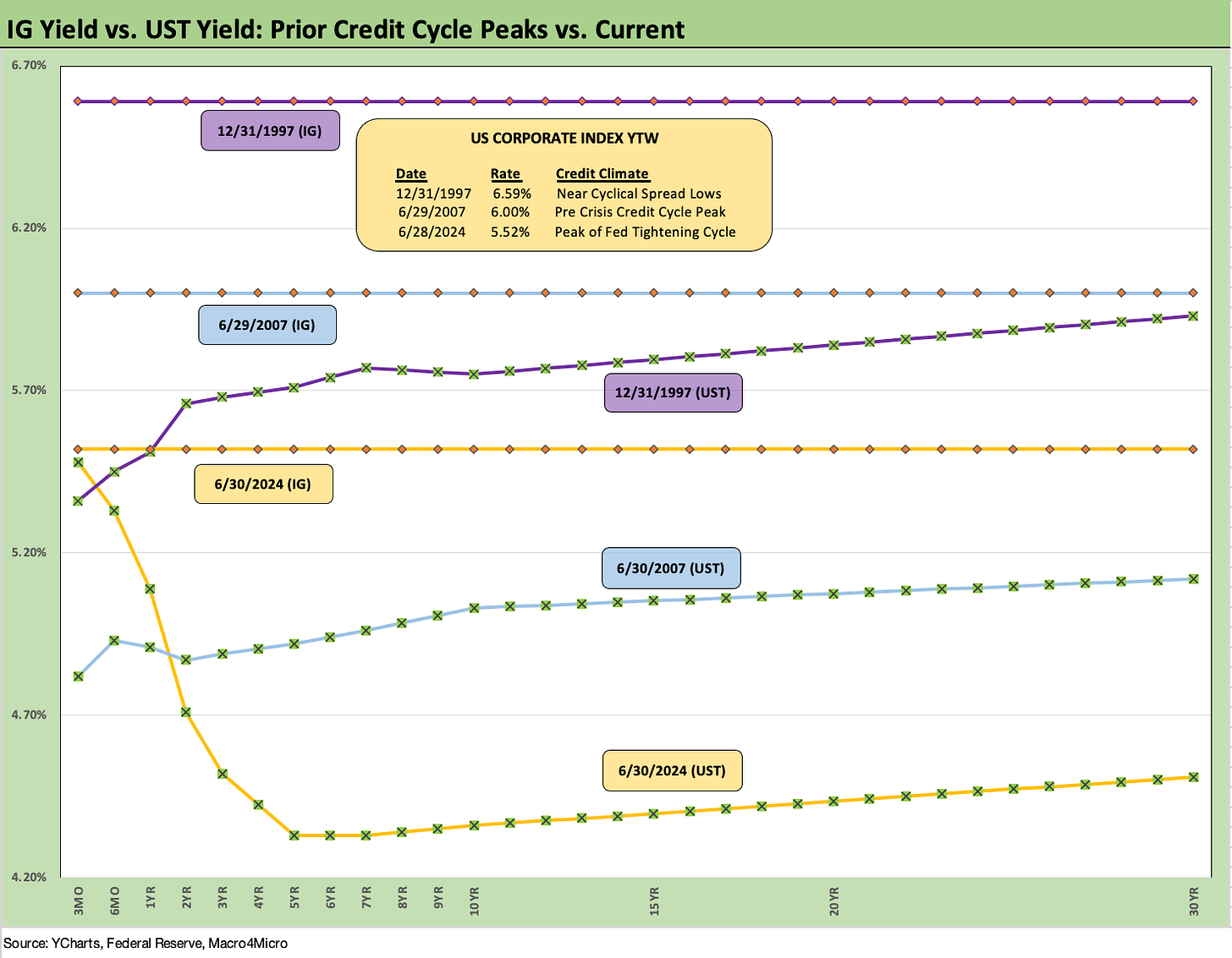 The above chart revisits two major credit cycle peaks, one in late 1997 and the other in mid-2007. We post the IG yields for these three periods using 6-30-24 levels and those from the end of 1997 and late June 2007. We also plot the UST curves of that period for context.