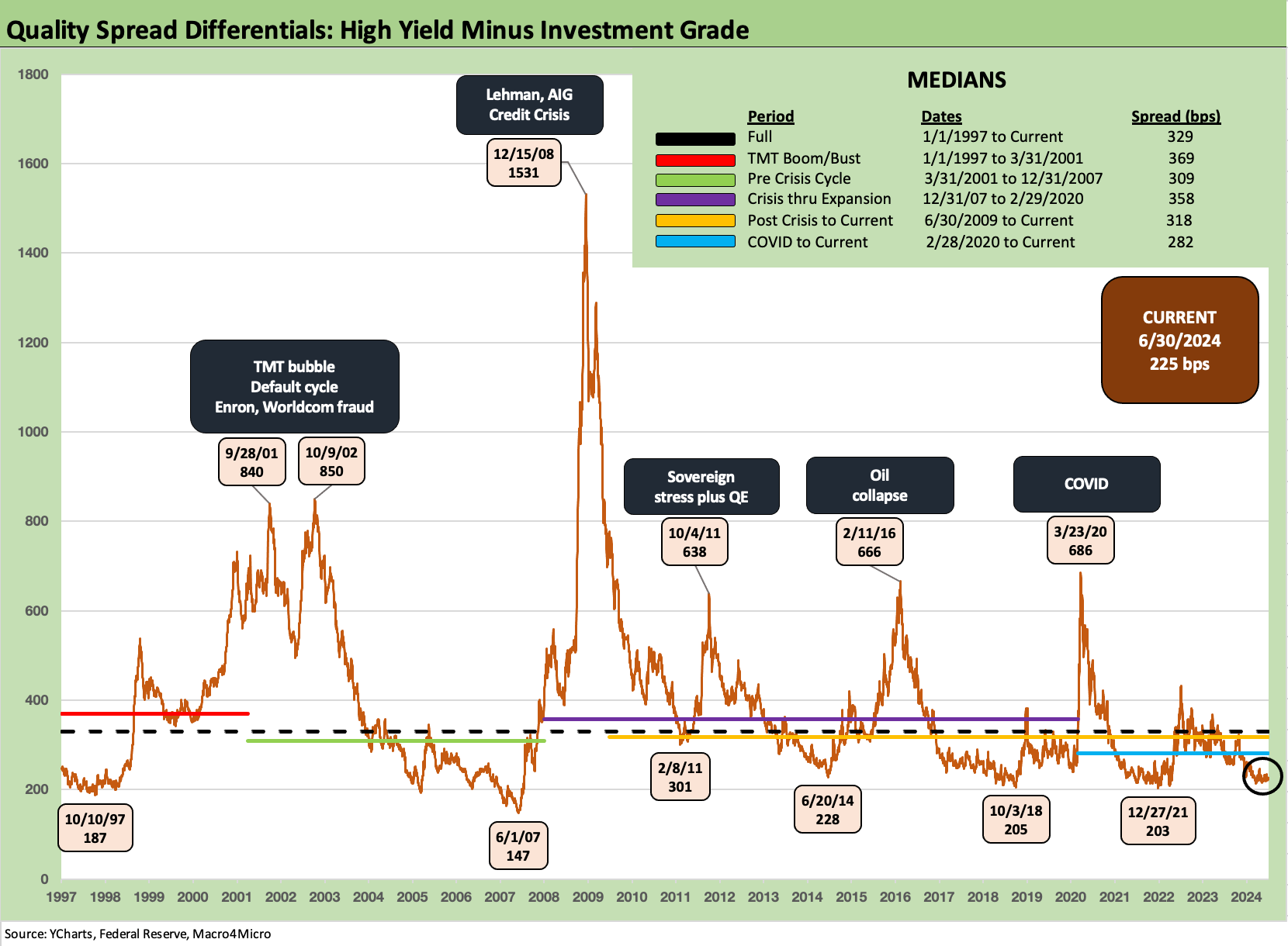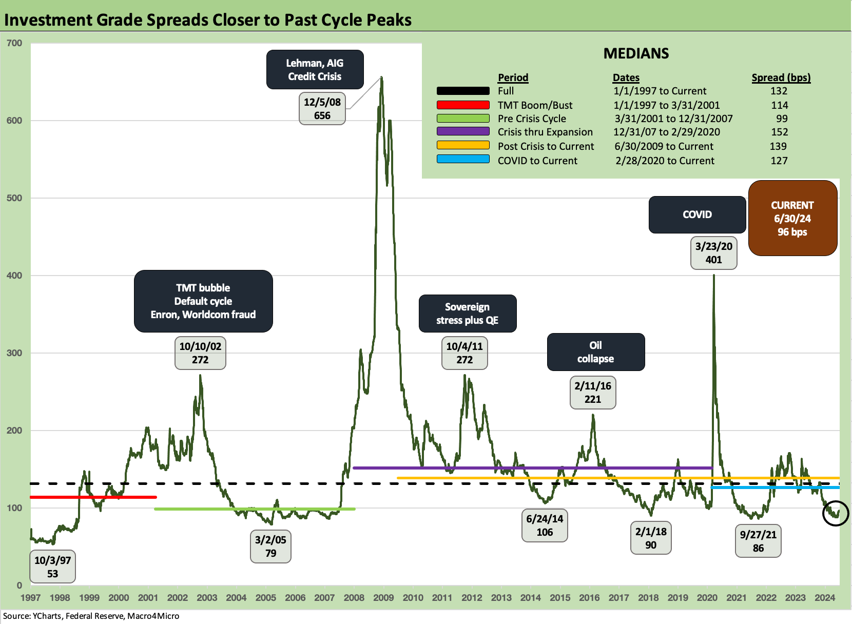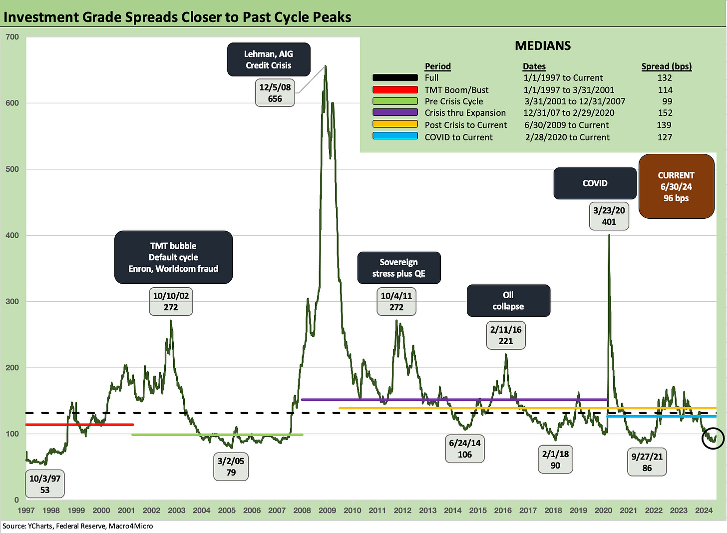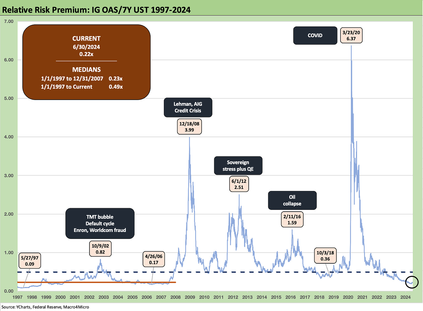 The above chart frames the running IG spreads across the longer term timelines. The highs and lows are noted with the current +96 bps still wide to the March 2005 tights (just before the auto downgrade fears and related volatility) and closer to the lower UST periods of June 2014 of +106 bps (ZIRP), +90 bps in Feb 2018 (mild normalization attempts by Fed during that period), and Feb 2021 at +86 bps (ZIRP). The 6-30-24 IG OAS of +96 bps is in the zone of the 1H04 to 1H07 average and the 1997-1998 average. Those periods offer a reminder that tight IG spreads can last for a protracted period.