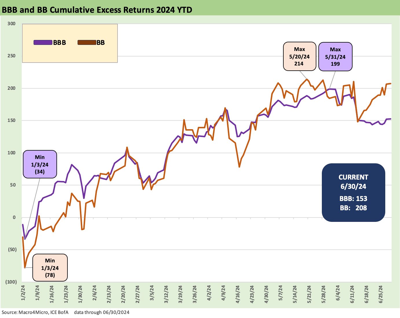 The above chart plots the BBB vs. BB running excess return patterns for 1H24. BBB vs. BB OAS has been compressed as we covered in our recent commentaries (see HY Spreads: The BB vs. BBB Spread Compression 6-13-24), and the incremental spread compensation is now down around past cyclical low points as we cover in a separate chart herein.