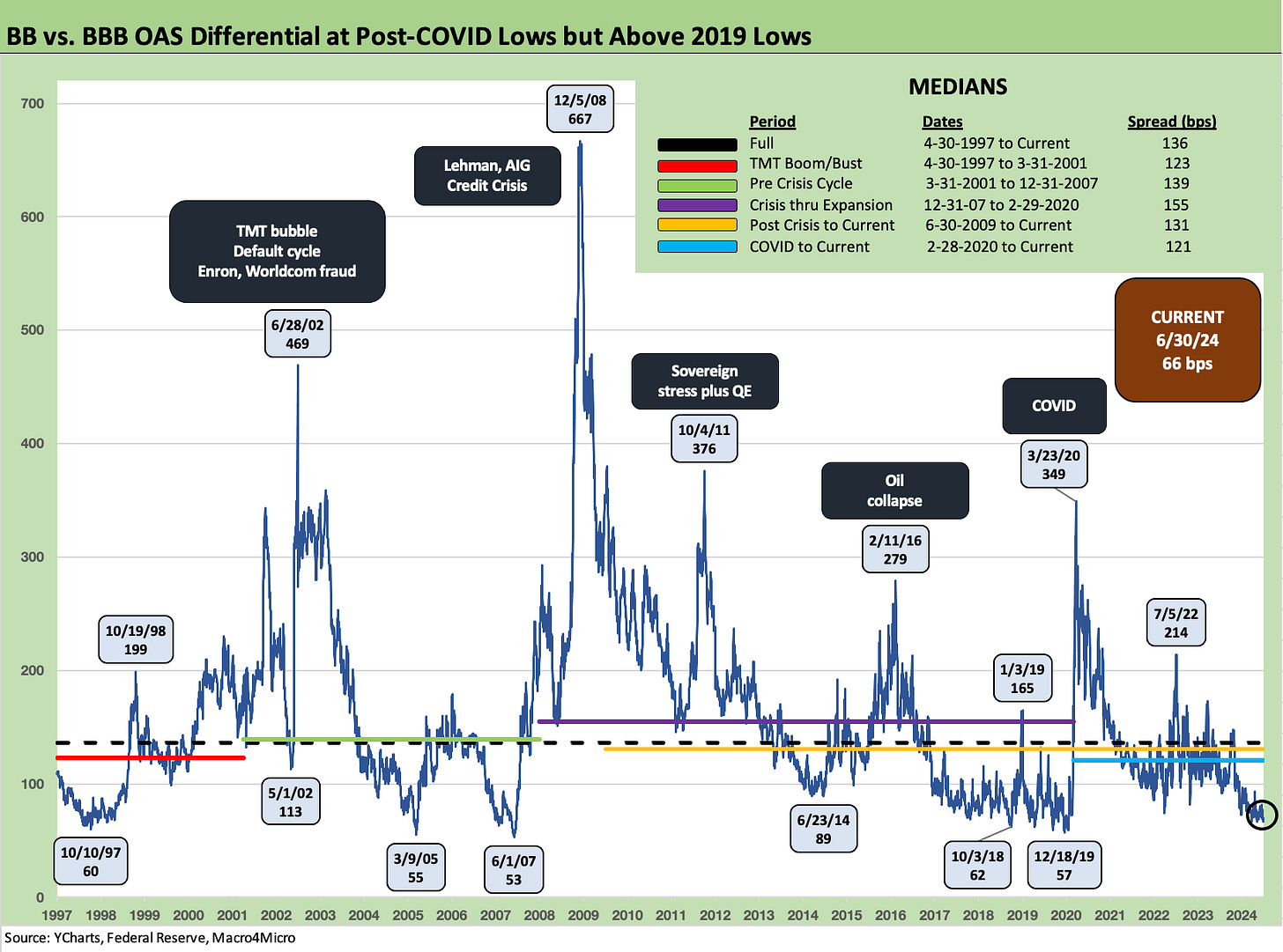 We see the recent BB OAS at +185 bps well inside the long-term median of +303 bps and sub-300 bps medians for levels since 1997 and up to 2007. The lows across the periods are noted, and the BB tier market now is in the low range and looks more like the par-plus BB tier index of early 2020 just ahead of COVID. The current BBB OAS is modestly wide to the May 2007 lows of +171 but more materially above the +136 lows of August 1997.