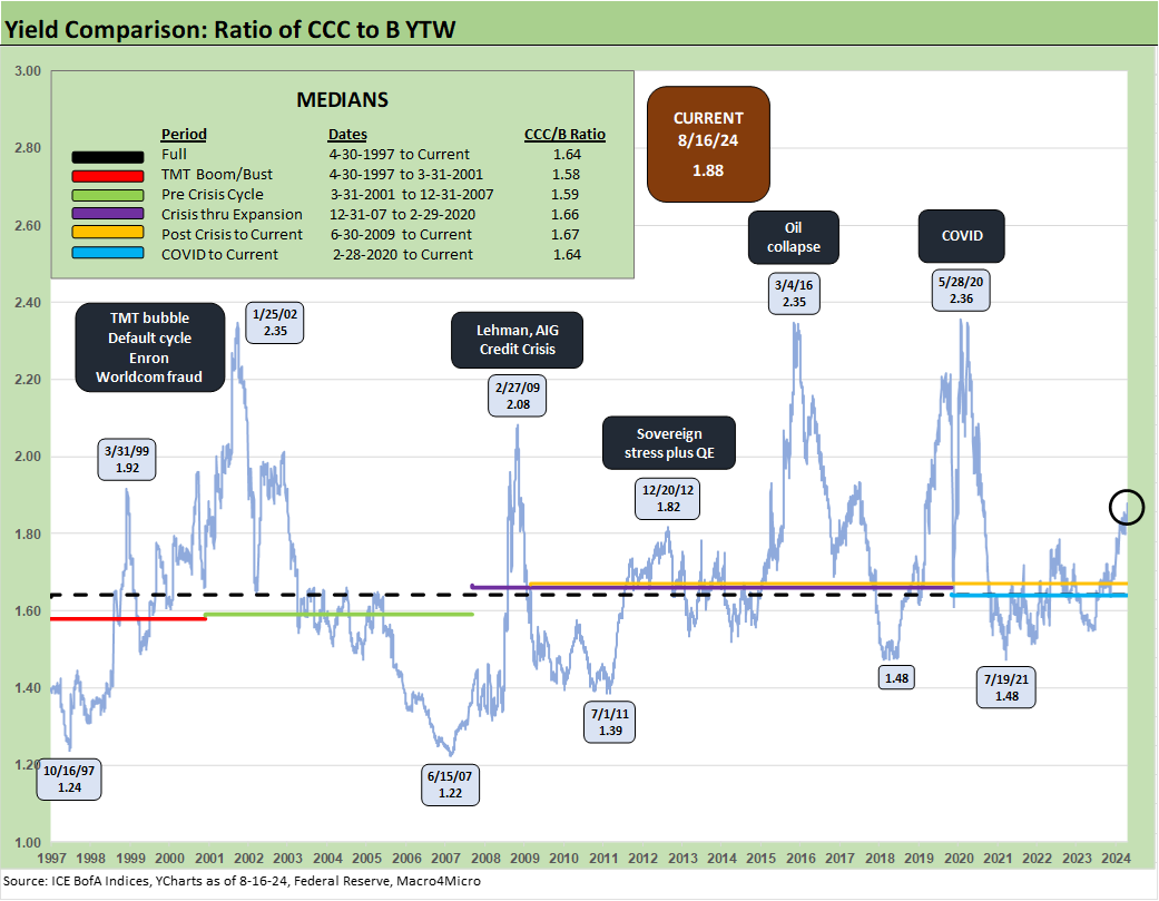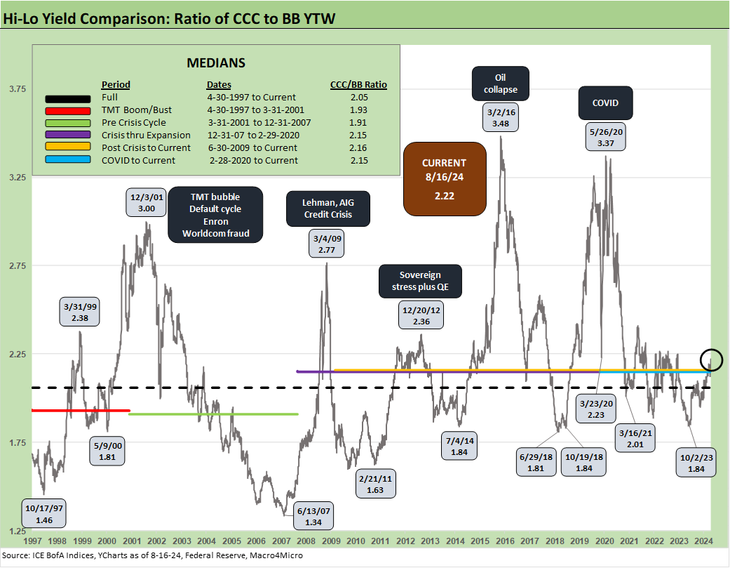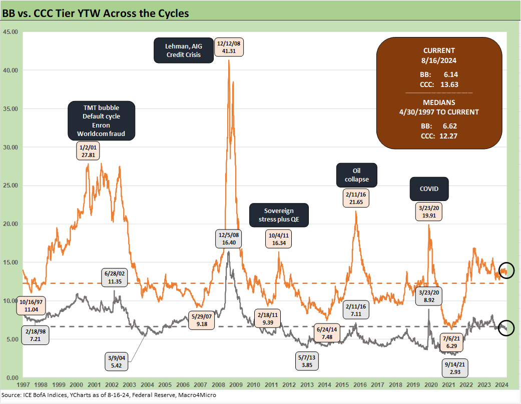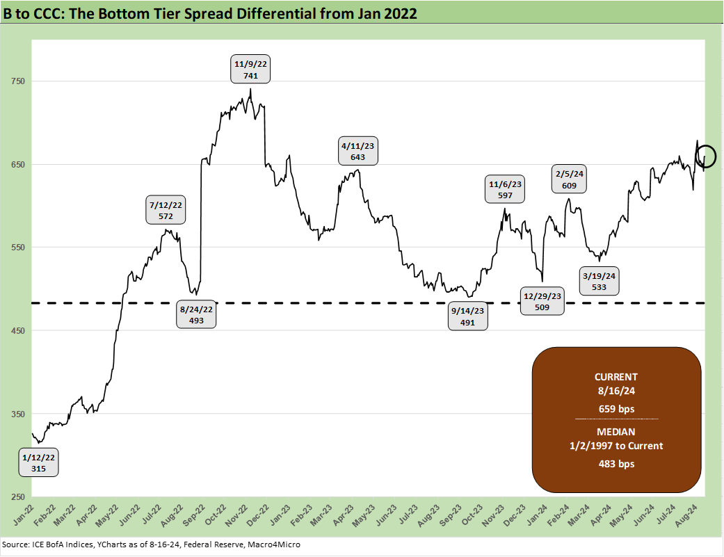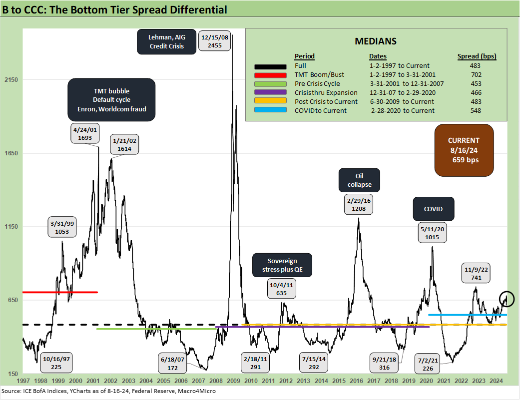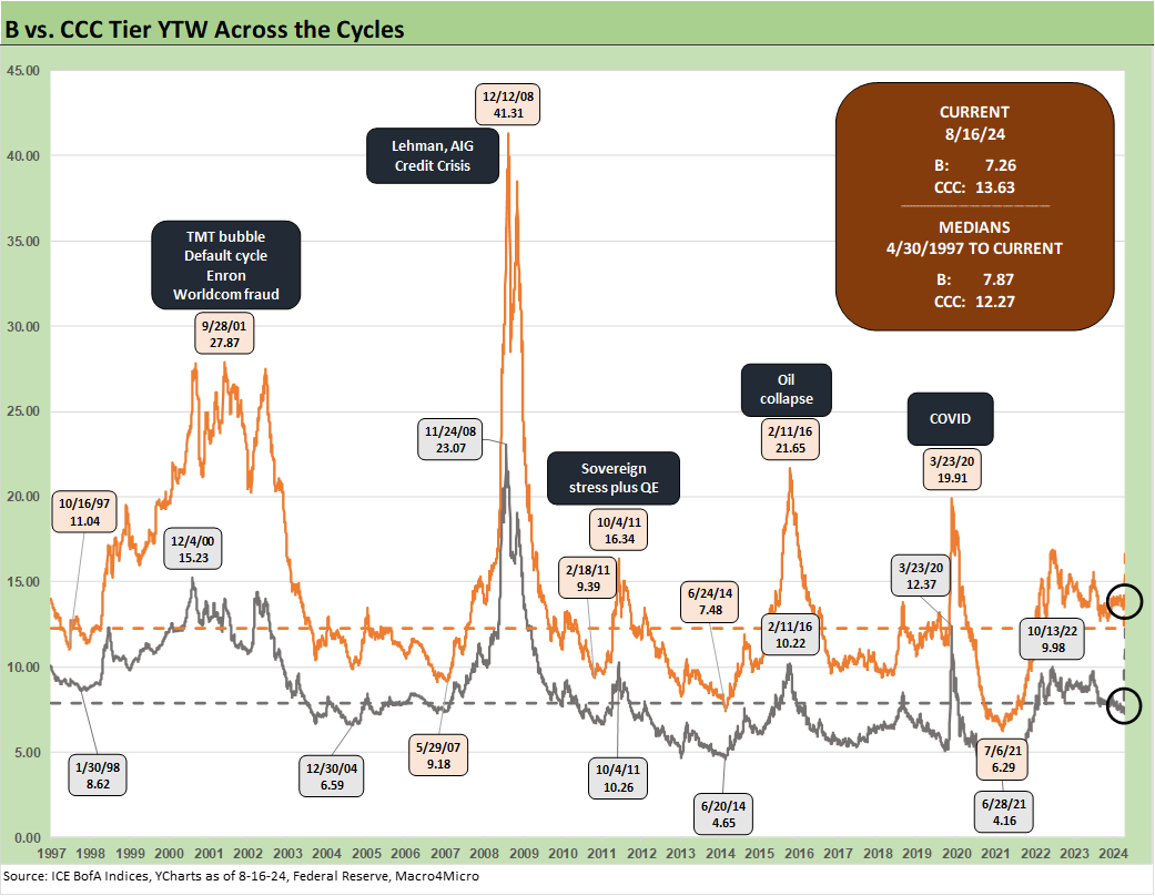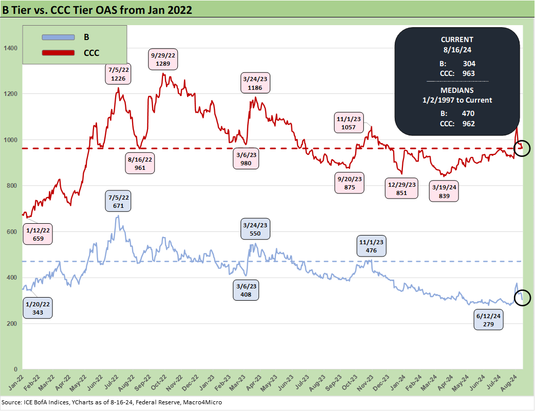 As noted earlier, we already discussed the quirks of the B vs. CCC relationship in a separate commentary (see The B vs. CCC Battle: Tough Neighborhood, Rough Players 7-7-24). An interesting twist is that the CCC tier OAS composite is around the long-term median, but we always add a qualifier to the CCC composite in that the name picking exercise rules and the Hi-Lo dollar price differentials across issuers in the tier are quite wide relative to the B tier. CCCs run the gamut from high credit risk to very high equity-like risk profiles.