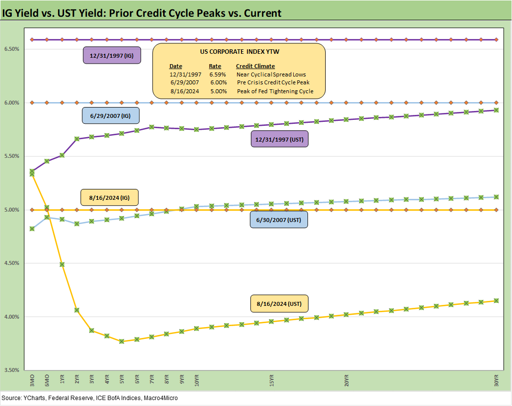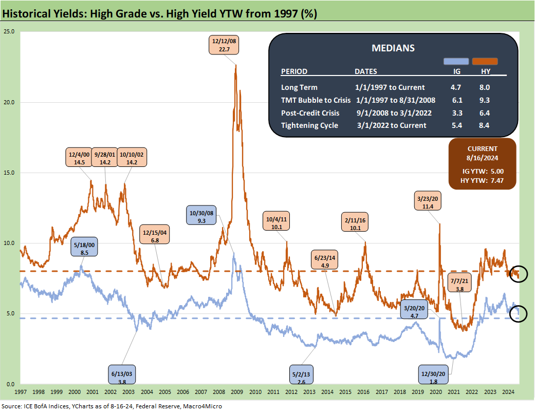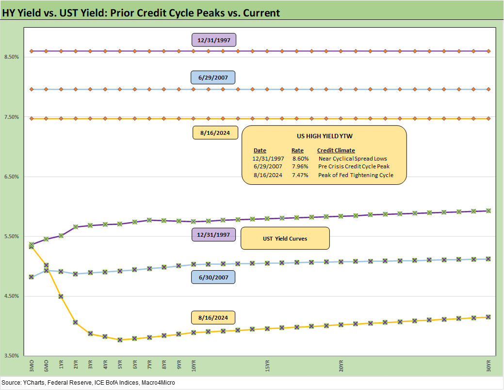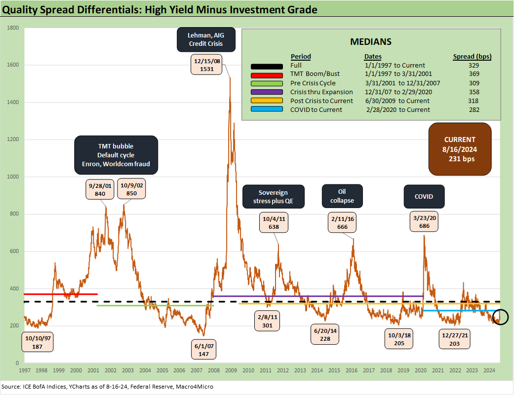 The return to +329 bps puts HY OAS inside the June 2014 lows and a few good days of compression above the Dec 2021 lows noted in the chart (+301 bps) and the Oct 2018 lows of +316 bps. We have looked at some of these earlier HY cycle spread lows in other commentaries (see HY Spreads: Celebrating Tumultuous Times at a Credit Peak 6-13-24).