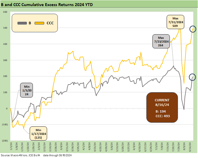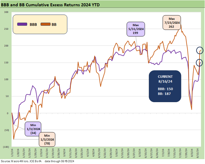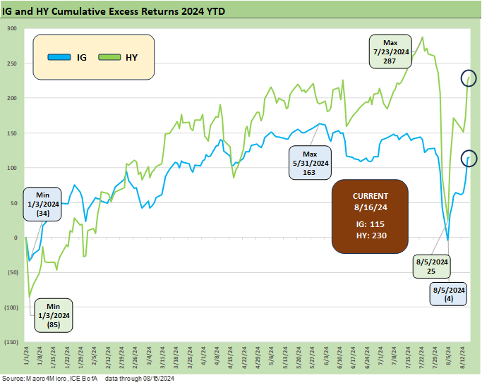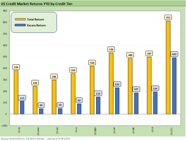 We lead with the usual YTD return profiles across the credit tiers where we look at total returns and excess returns. The total return metrics are improving with the UST delta backdrop for the YTD 2024 period as we detailed in our separate Footnotes publication on yields (see Footnotes & Flashbacks: State of Yields 8-18-24).