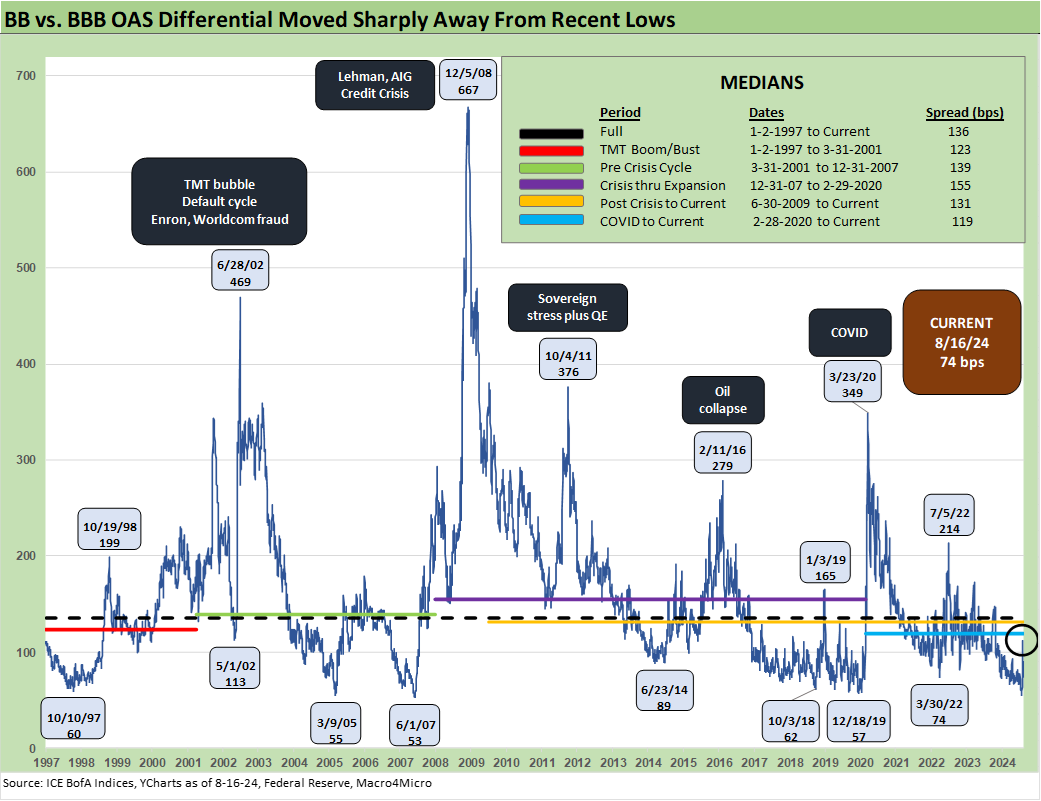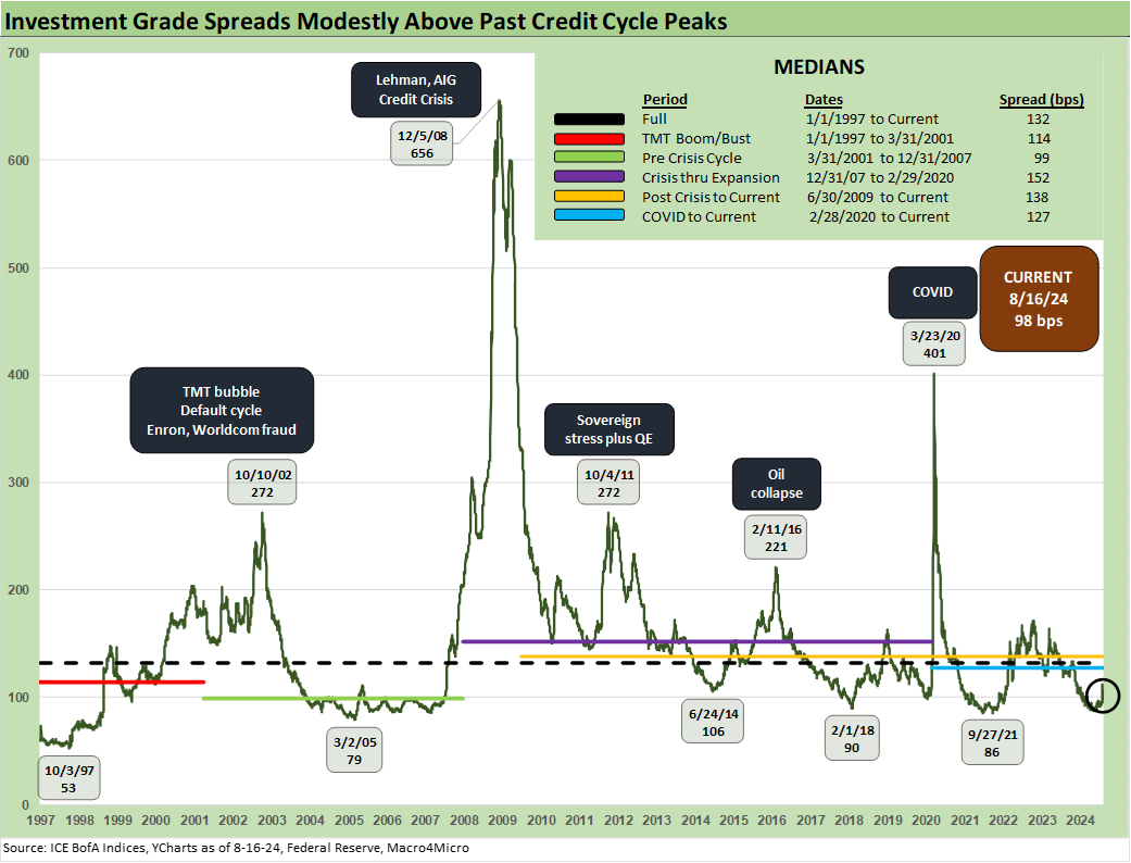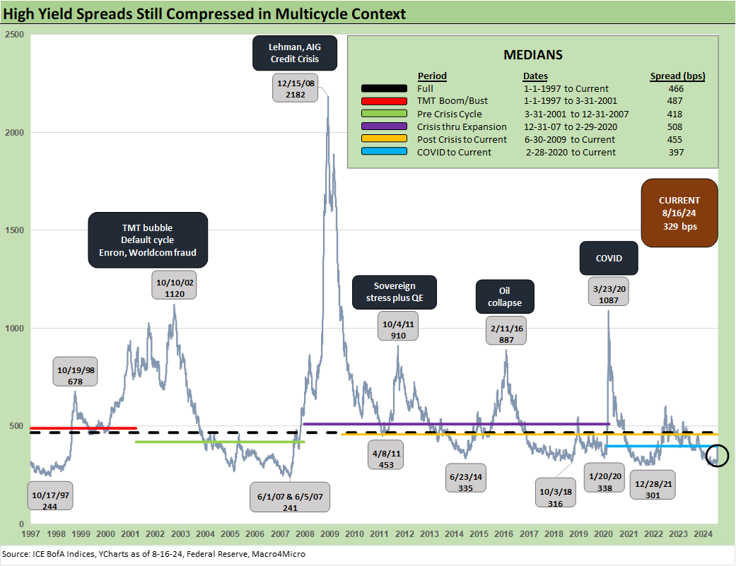 The ride from +335 on Thursday (8-1-24) before the Friday (8-2-24) payroll report and VIX spike and Monday (8-5-24) VIX replay saw HY OAS gap out to +393 bps ahead of the rally that wrapped this past Friday with a close of +329 bps. It is worth highlighting that the peak HY at the end of those two ugly sell-off days to hit +393 bps was still well inside the long term median of +466 bps.