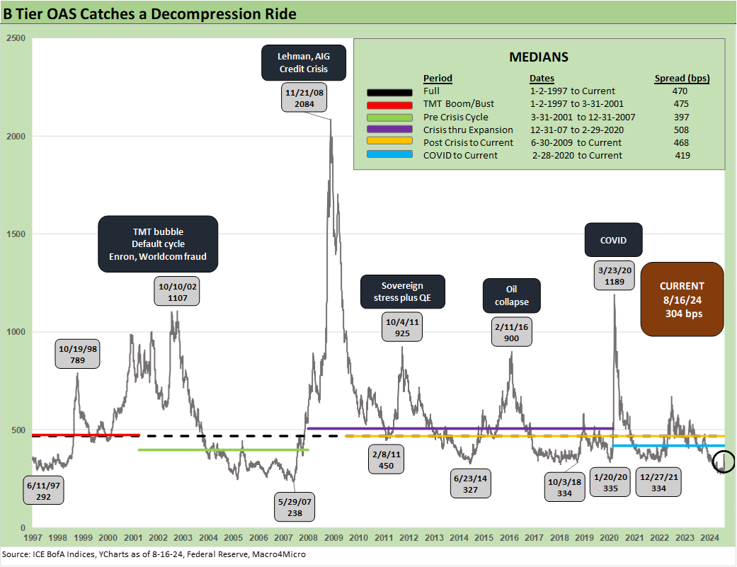 The B tier is the sweet spot of the HY Classic investor and tells a story of compression with the current post-rally level of +304 bps back inside where HY left off on 8-1-24 at +313 bps. That compares to a long-term median of +470 bps and is inside all the lows listed above across 2021, 2020, 2018, and 2014. It is a long way from the May 2007 low of +238 bps.