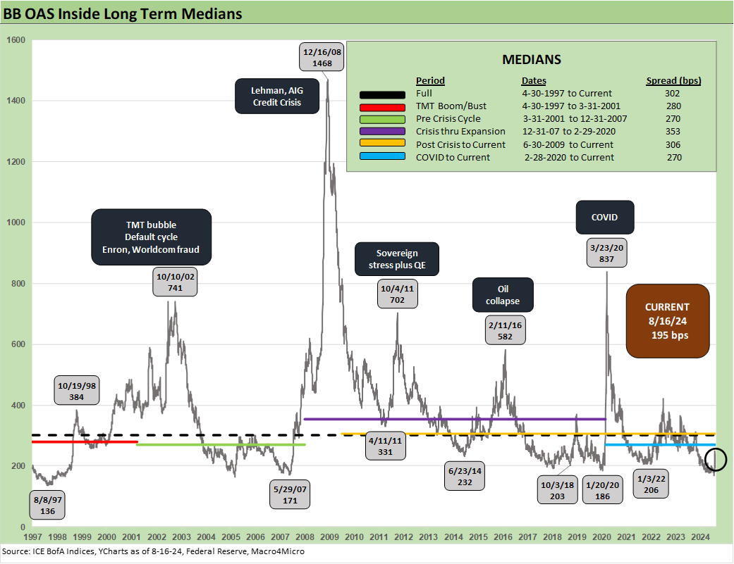The BB tier rallied from +249 bps on volatility Monday (8-5-24) to +195 bps to end last week. The long-term median for BB OAS is +302 bps, so spread compression remains the theme with the Friday close of +195 bps almost down to the lows of Jan 2020 (+186 bps) and tighter than the lows of Jan 2022, Oct 2018, and June 2014 as noted in the chart.