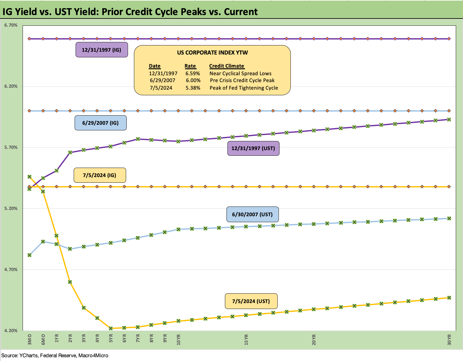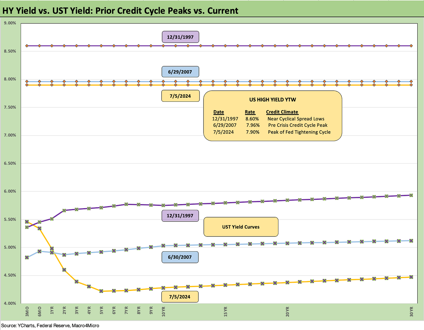 The above chart is one we like to use regularly for a gut check on prior credit market peaks in IG and HY. We use late 1997 and mid-2007 as good examples of credit excess to frame the yields then vs. now. As we cover above in the spread sections and as we detail in our historical yield charts across the non-ZIRP credit cycles (see Footnotes & Flashbacks: State of Yields 7-7-24), the UST curve today is in fact quite low for all of the bitching and moaning one hears about the Fed and rates. Similarly, spreads are compressed by any standards even if they have been tighter in some past cyclical lows.