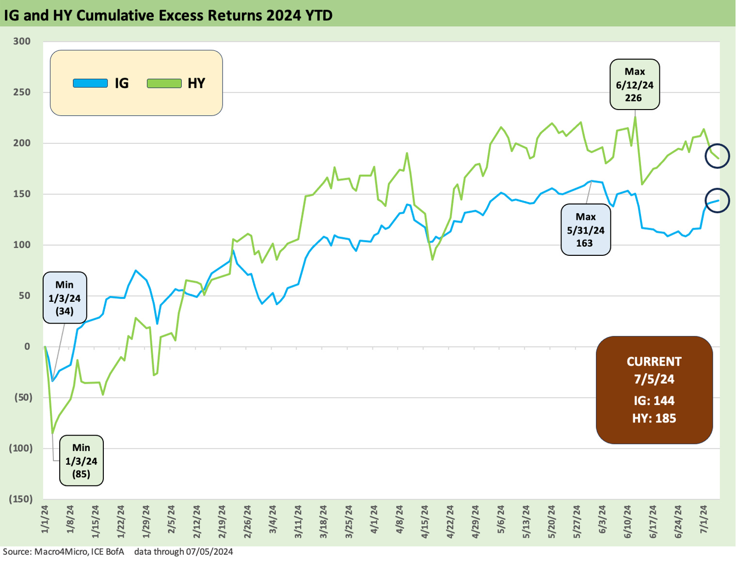 The above chart plots the running excess return differentials of IG vs. HY, and the compression is evident in the modest additional return delivered by a HY index with high single B par-weighted credit quality vs. the low single A par-weighted IG index. Credit risk has been winning in 2024, but risk handicapping gets tricky from here. We should get some good color from the major banks to end this week and into next. The trick is the wide gap in policy risk that comes later.
