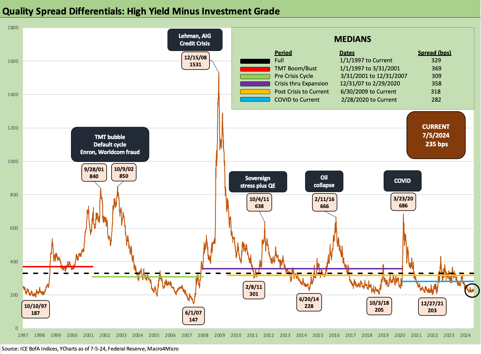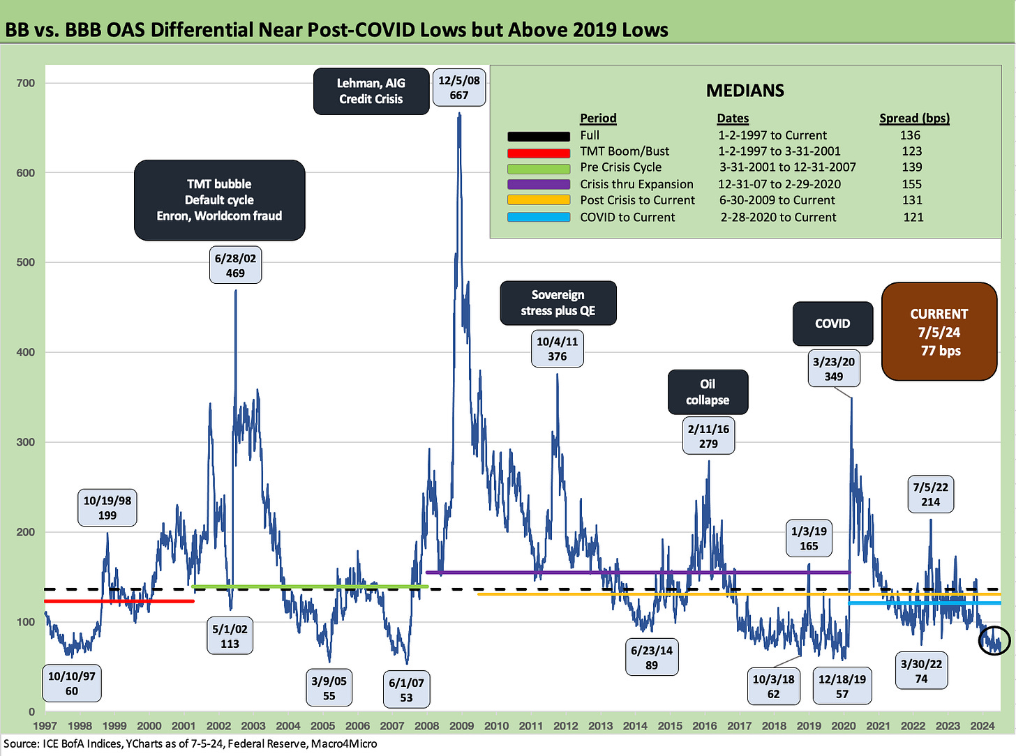 We drilled down into the CCC tier profile in a detailed commentary posted on Sunday (see The B vs. CCC Battle: Tough Neighborhood, Rough Players 7-7-24), but we move up the spectrum to look more closely at the IG vs. HY relationship in this week’s Footnotes.