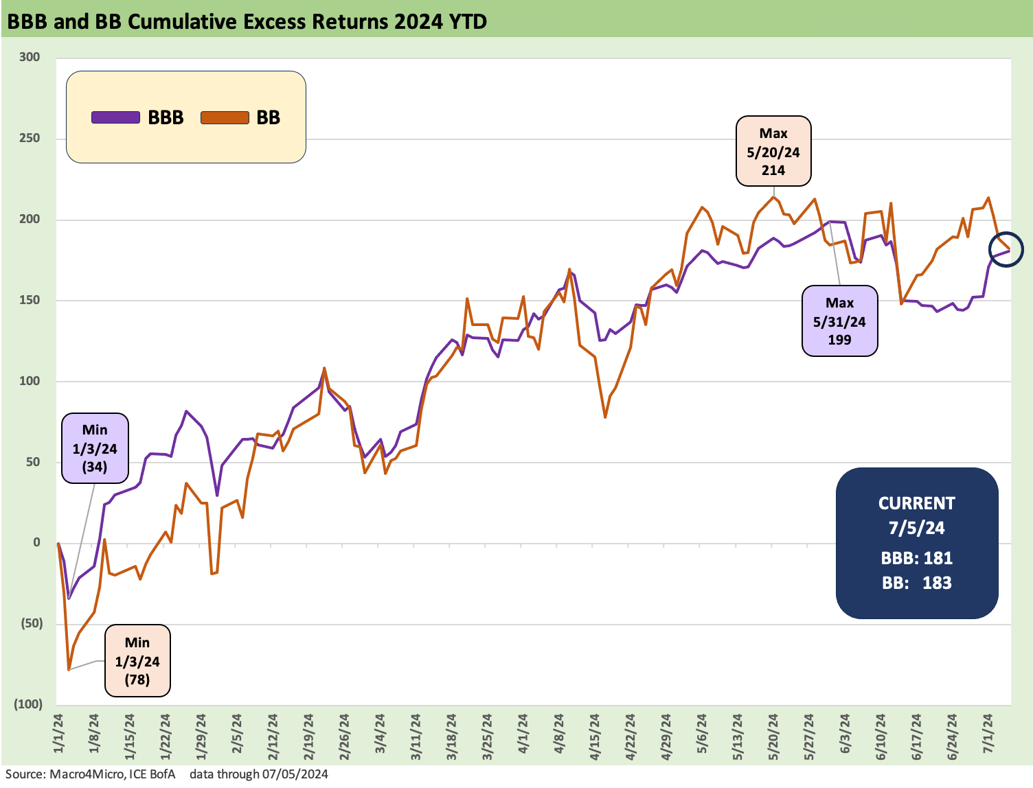 The above chart updates the running excess return differentials for BBB vs. BB, and they are running neck and neck through July 5. That somewhat defies the rule of “getting paid more for additional credit risk.” The idea of taking a fresh look at the BBB vs. BB mix by name and sector is a standard part of investor duties anyway, but the spread compression and return compression raises some flags around relative value of BB vs. BBB. BB looks too narrow vs. BBB although on the cusp issuer selection reigns supreme.