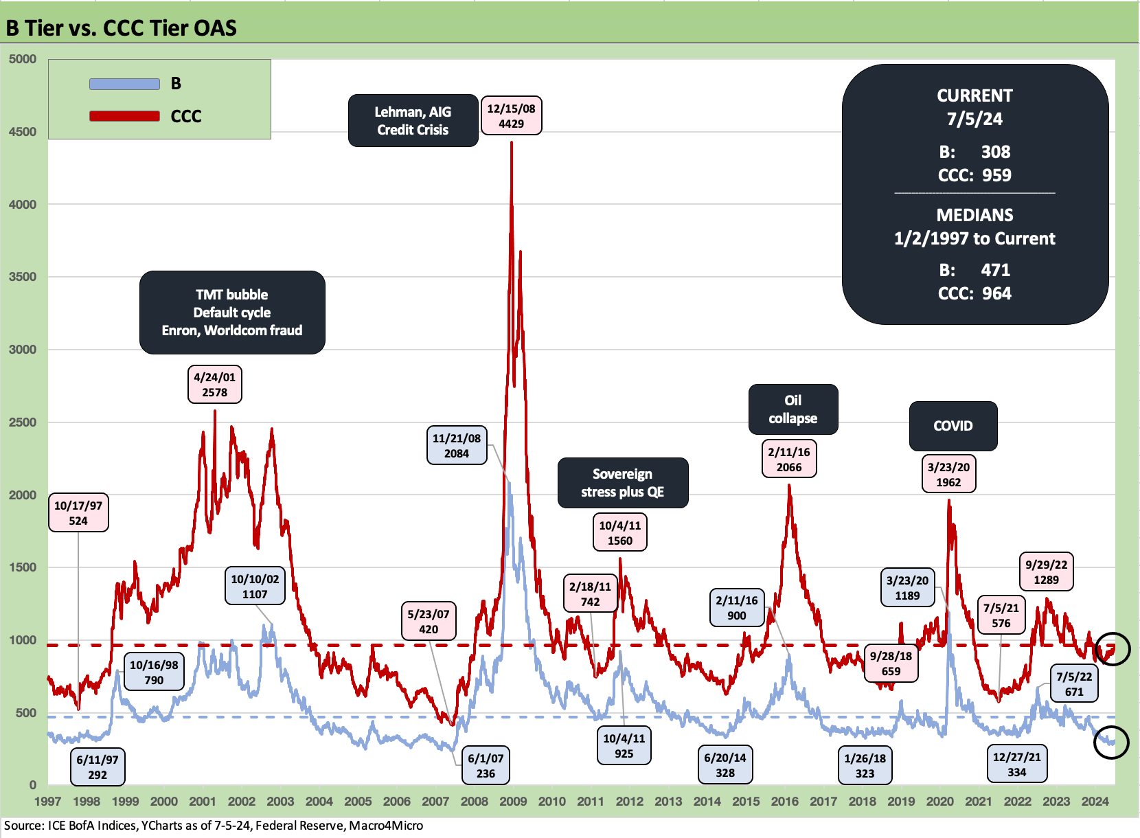 The above chart updates the B tier vs. CCC tier as of Friday close (7-5-24). We did a deep dive into the history of the lower tier relationships in a recent commentary (see The B vs. CCC Battle: Tough Neighborhood, Rough Players 7-7-24). We refer the reader to that analysis for more discussion, but the main story is that the asymmetric risk in the B vs. CCC relationship has been a wild ride over the cycles with each cycle having its own unique set of industry and issuer dynamics.