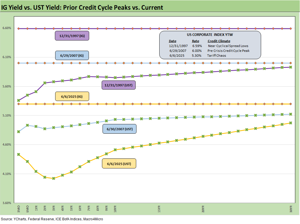 The above frames current IG index yields vs. previous credit peaks along with their respective UST curves. We include both prior credit peaks in June 2007 and Dec 1997 for context as prior peak credit cycles when high risk appetites saw investors chasing yields. Those 1997 and 2000 markets saw poor risk symmetry and low spreads.