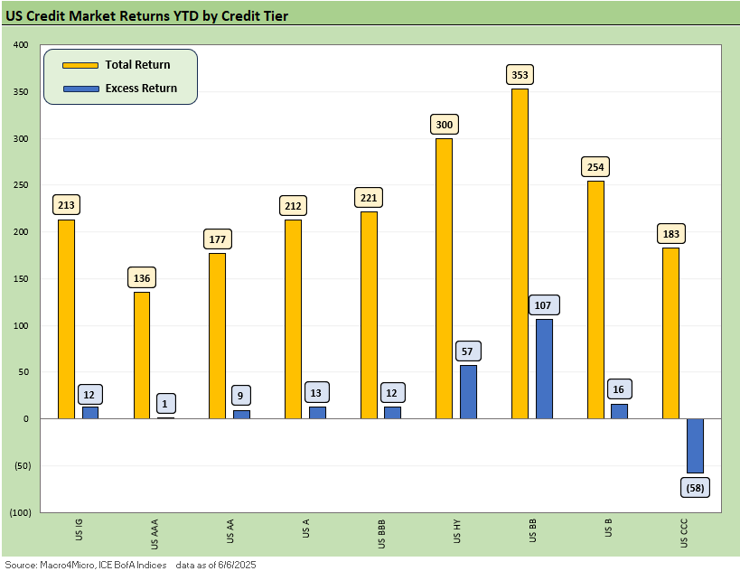 The return picture for the US credit markets shows continued improvement on the spread rally last week even with some detraction from the UST (see State of Yields). Excess returns have eked into positive territory across the board except for CCCs at -58 bps. BB remains the top excess return performer at +107 on YTD spread tightening and also tops total return given its curve exposure. That said, the 2025 YTD return picture still leaves a lot to be desired in an average total return year and barely positive excess return one.