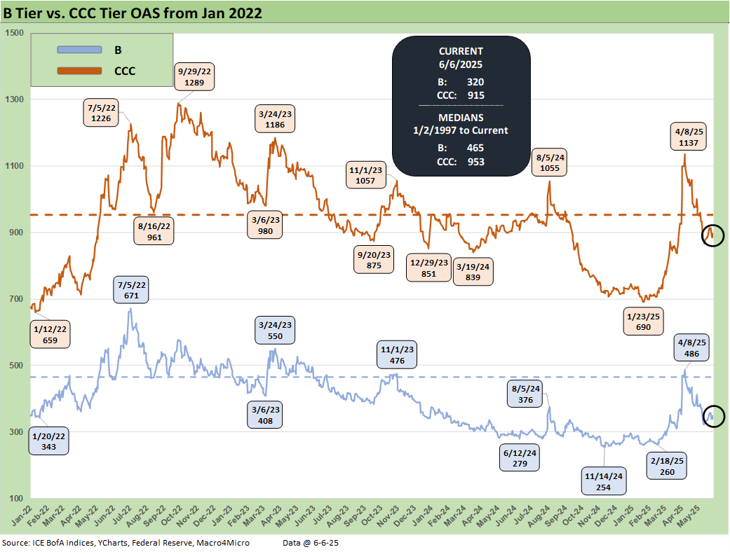 The B tier tightened -29 bps this week down to +320 bps. The reciprocal tariff whipsaw reminded the market how volatile this layer of credit can be as spreads briefly moved above the long-term median at +486 bps. The relief rally has recovered -167 bps tighter since. The current level returned back below 2014 and 2018 lows. At only +24 bps wider YTD, the risks appear skewed to widening again. We see these levels as offering inadequate compensation for the array of trade risks still in the market.