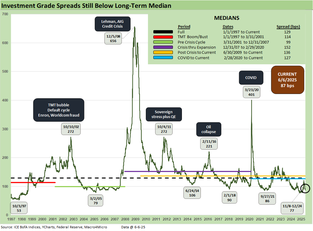 This week saw -22 bps of tightening for US HY down to +309 bps with spreads returning to the low +300 range. This week’s rally sees spreads below the 2014 and 2018 cyclical lows and need a lot to go right on the trade front to remain at these compressed levels. The pain came quickly in late 2018 with the Fed having leeway to come to the rescue in 2019. The extent of inflationary pain may curb their ability to do the same this time around if payroll impact lags as the impact of tariff policies largely remains a question mark (see Past-Prologue Perspective for 2025: Memory Lane 2018 6-5-25).
