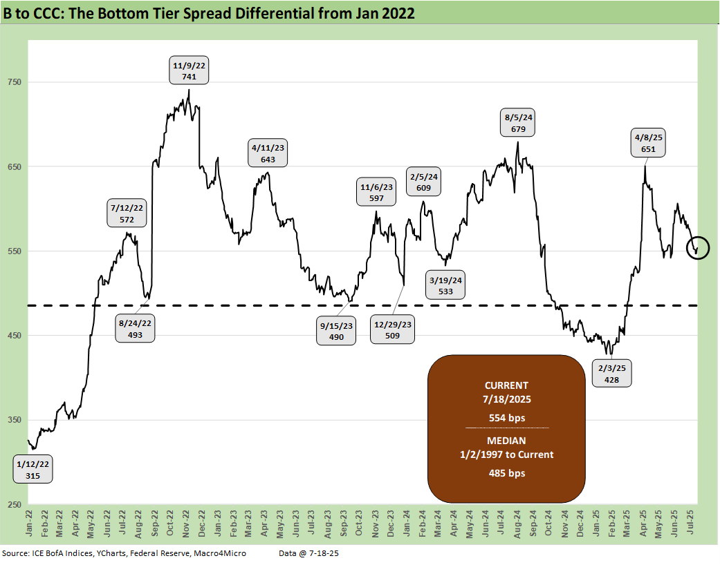 The B vs. CCC tier OAS time series is plotted above. The timeline for B and CCC spreads highlights the points of major divergence along the way (see The B vs. CCC Battle: Tough Neighborhood, Rough Players 7-7-24).