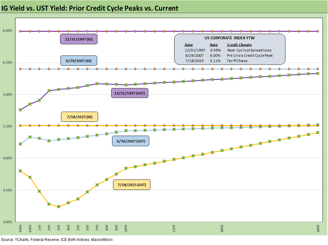 The above frames current IG index yields vs. previous credit peaks along with their respective UST curves. We include both prior credit peaks in June 2007 and Dec 1997 for context as prior peak credit cycles featured high risk appetites and saw investors chasing yields. Those 1997 and 2000 markets saw poor risk symmetry and low spreads.