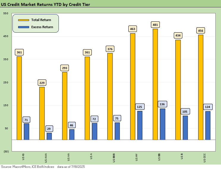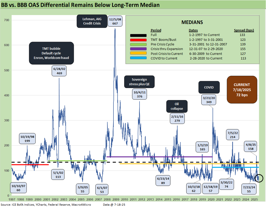 Total returns show the benefits of the modest bull steepener that has supported the short to intermediate UST curve segment (see Footnotes & Flashbacks: State of Yields 7-20-25). That duration angle can support the trade-off along the BBB/BB divide for the now well-established HY Light strategy.