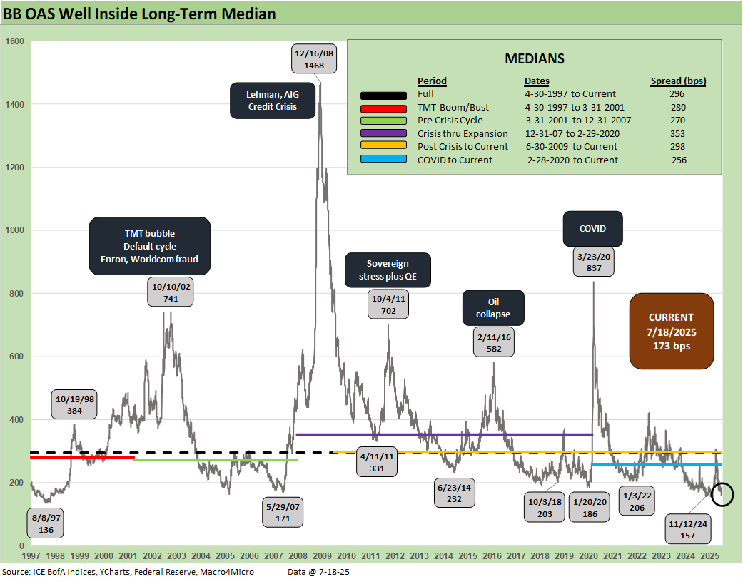 Grinding tighter to +293 bps, the HY OAS is in an increasingly rare territory with a 200-handle that only the June 2007 and recent 1Q25 lows share. These levels are inside the pre-COVID Jan 2020 levels and the prior cyclical lows of Oct 2018 and Jun 2014. The recent 2024 lows of +260 bps and +259 bps in Jan 2025 mean the uber-bulls will stay in the game, but the tariffs are slated to come in force as of Aug 1, and the consumer is slowing down as noted in numerous recent releases. We get the new set of personal income and outlays data late this month with PCE inflation that will test the constructive retail sales numbers from this past week. That presents a delicate balancing act for the FOMC amid stagflation concerns.