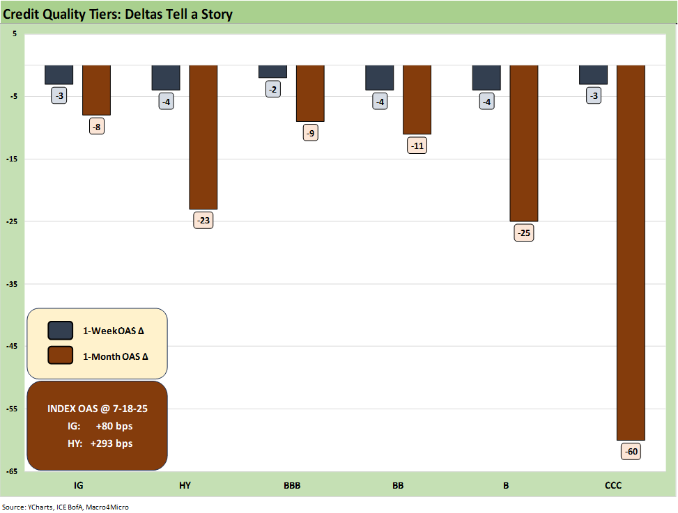 Spreads grinded modestly tighter with IG tighter by -3 bps and HY -4 bps in a quieter week that saw the heavy launch of the June quarter earnings. The first round of bank earnings echoed a healthier consumer sector signaled from both retail sales and consumer sentiment as initial inflationary tariff expectations started to moderate. Inflation evidence is there in some product categories, but the real test lies ahead.
