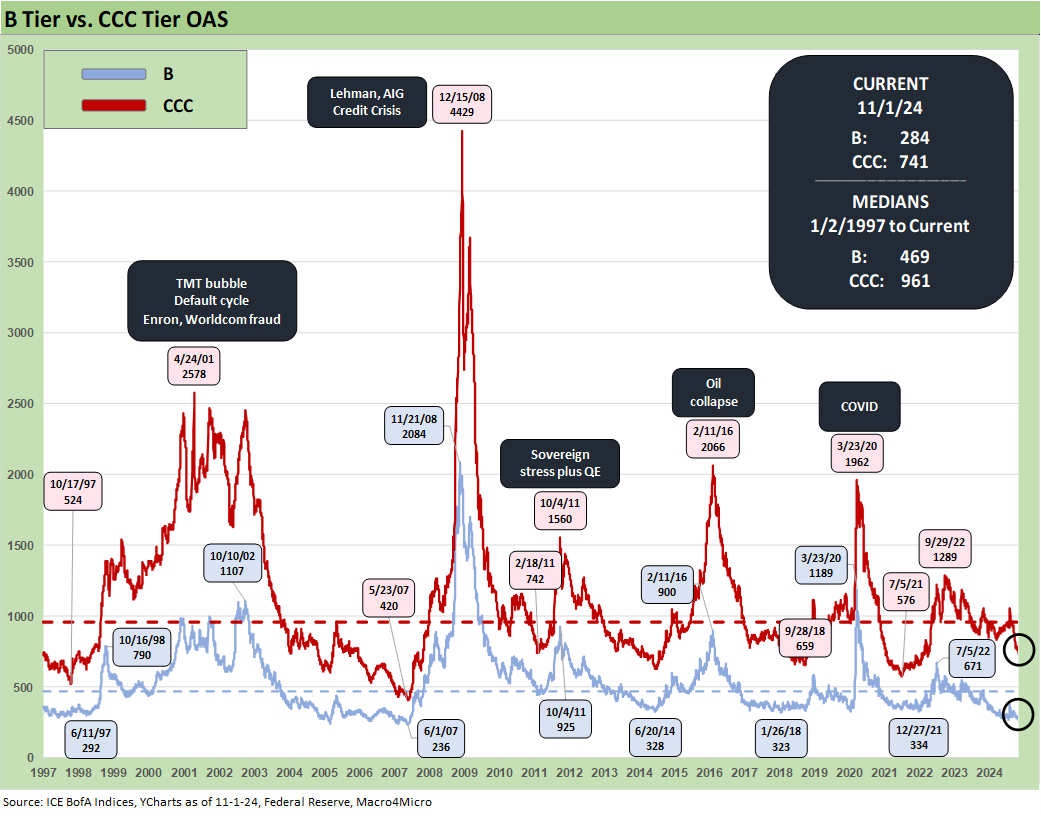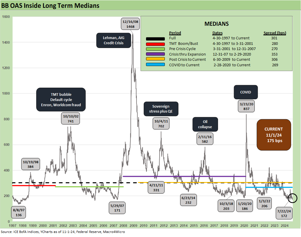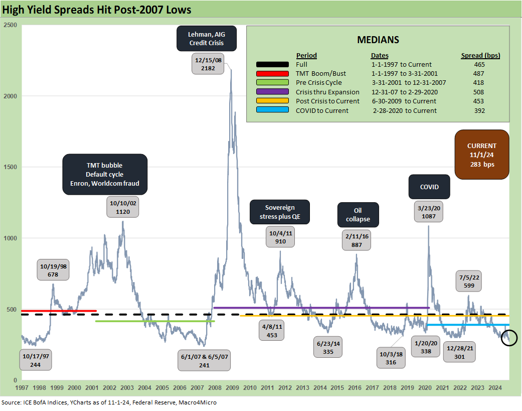 As noted in the prior chart comments, HY was -6 bps tighter on the week and -23 bps tighter over the trailing month and down to +283 bps. The ability of the HY index to remain below +300 bps for a protracted period has been seen before in credit cycle peaks such as 1997 (see HY OAS Lows Memory Lane: 2024, 2007, and 1997 10-8-24) and to a lesser extent in early 2007 (before it all blew up).