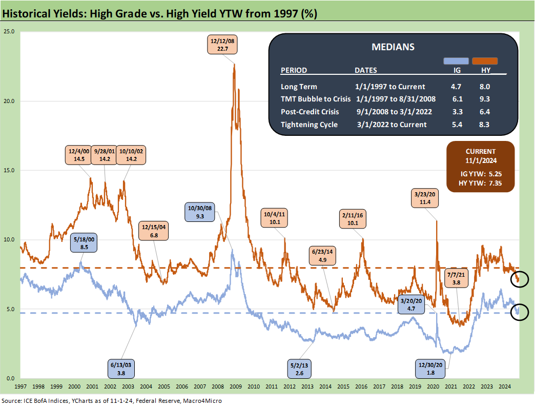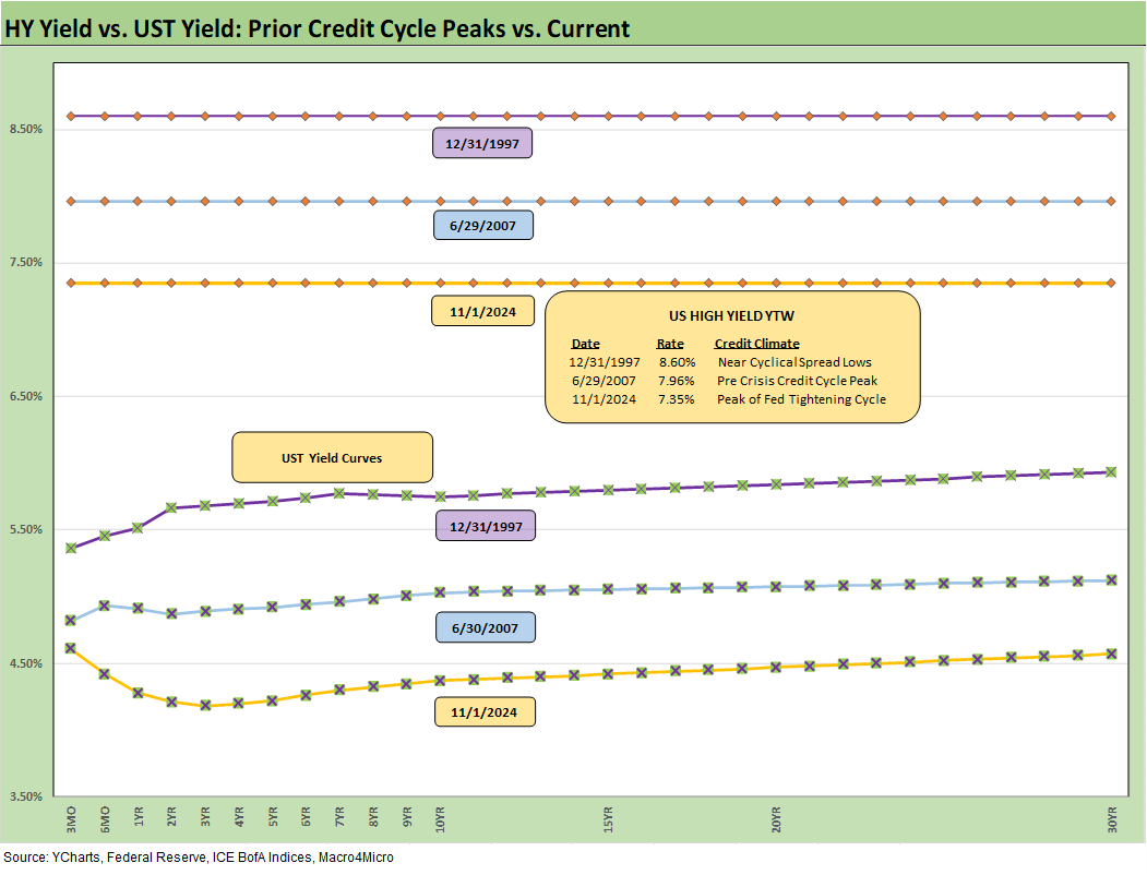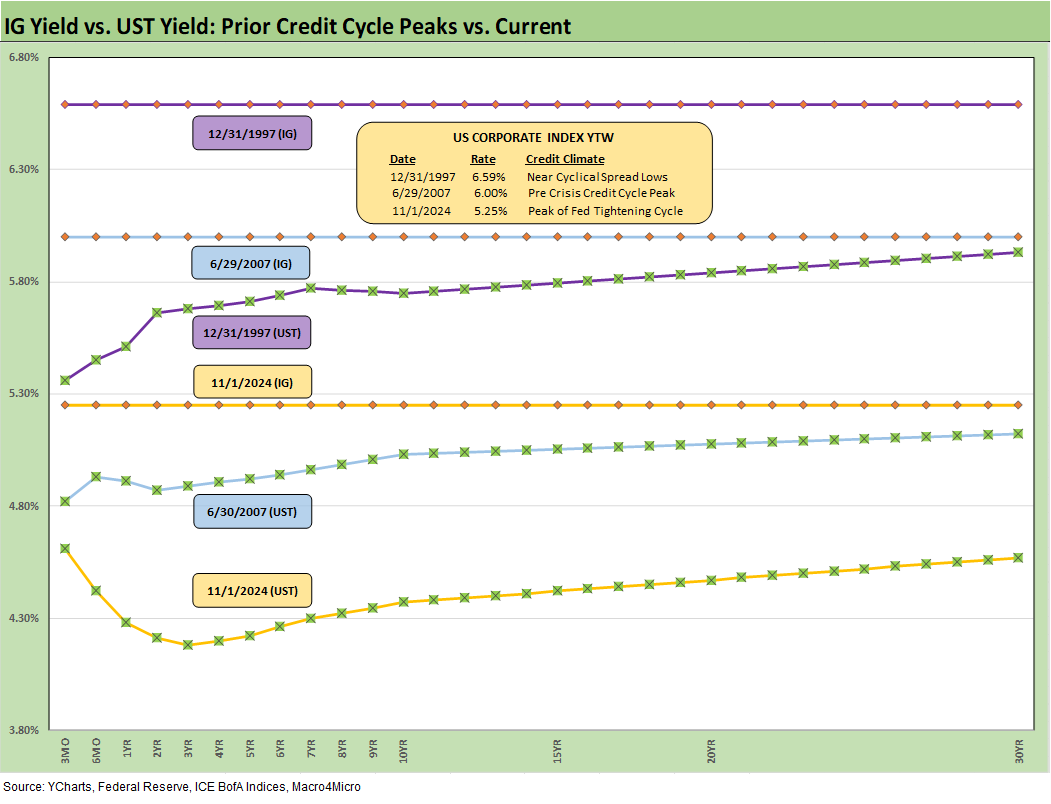 The current IG and HY index YTW levels reflect the very compressed spreads and a low yield curve very unlike anything we have seen outside the ZIRP markets across UST histories since the Carter years (see Footnotes & Flashbacks: State of Yields 11-3-24).